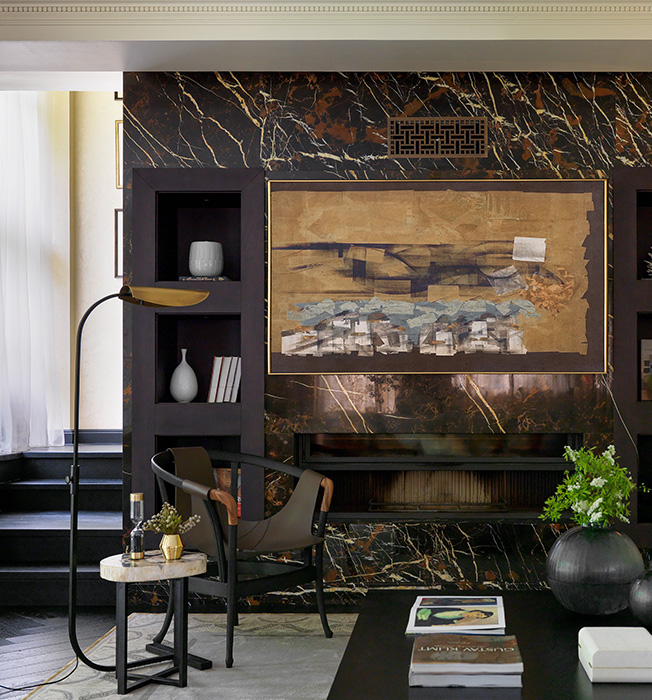 Стеллаж и каминный портал разработаны специально для проекта. В отделке использован мрамор Black and Gold. Кресло Giorgetti. Торшер Visual Comfort. Над камином — японская живописная абстракция.
