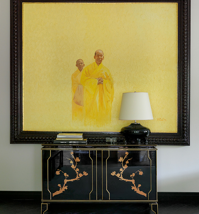 Как вспоминают дизайнеры, комнаты были заполнены тяжелой мебелью а-ля Прованс. Единственное, что их заинтересовало, — две огромные картины в массивных рамах красного дерева, привезенные заказчицей из Вьетнама. Вместить их из-за крупных размеров было непросто, тем более что, согласно фэн-шуй, работы предстояло расположить в строго определенных местах.