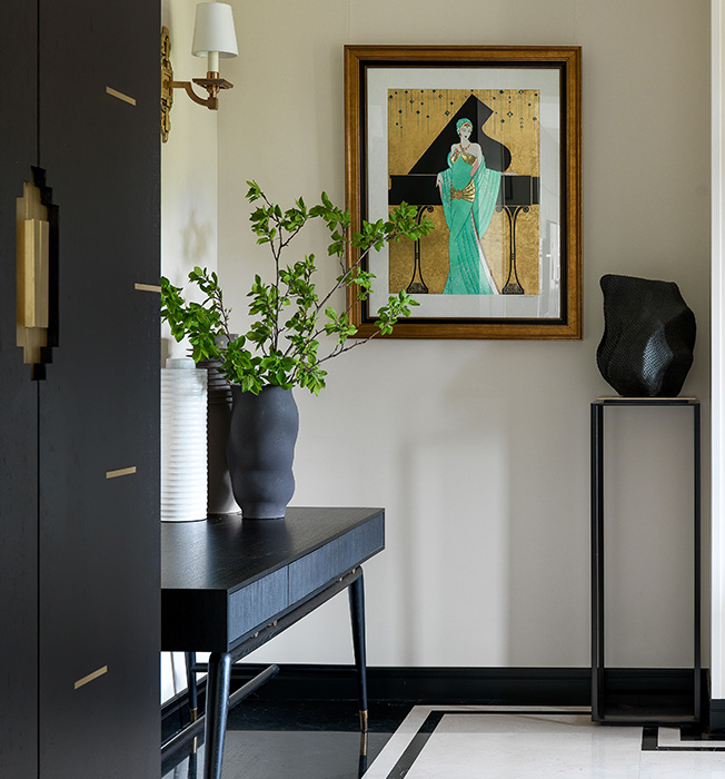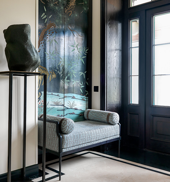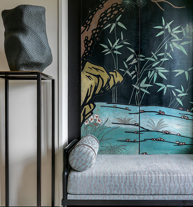 Из вьетнамской ширмы XIX века дизайнеры сделали панно, створки которого закрывают электрощиток. Банкетка: индивидуальный дизайн. Ваза GK Concept. nonehttps://www.instagram.com/gs_interiors_design/https://www.facebook.com/profile.php?id=100000661072553http://gsinteriors.com/