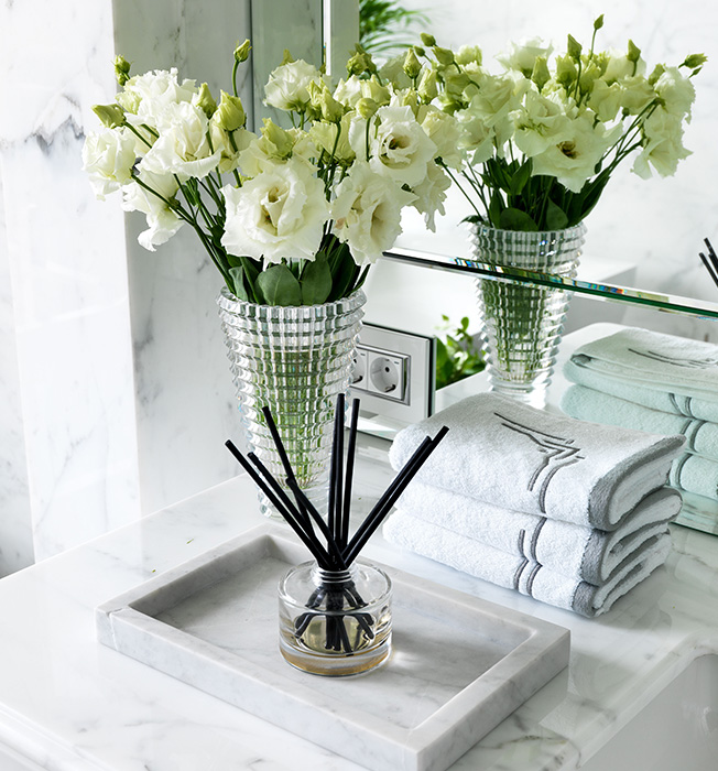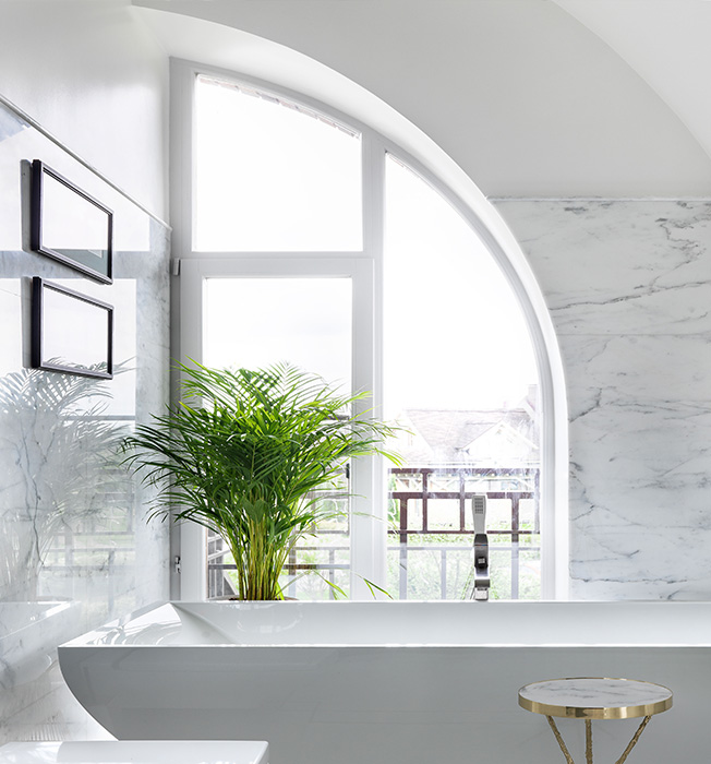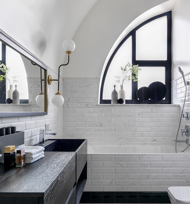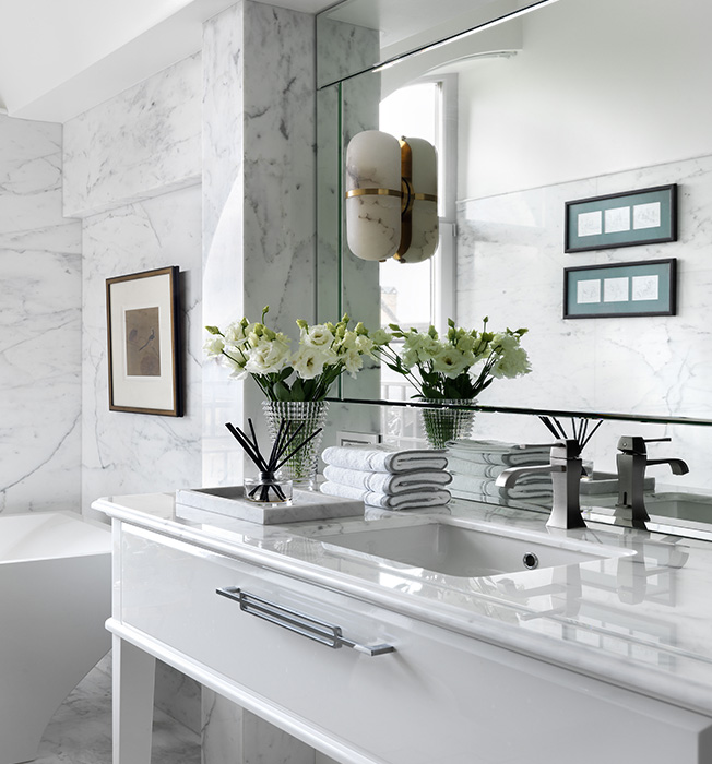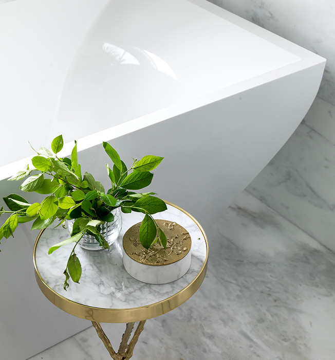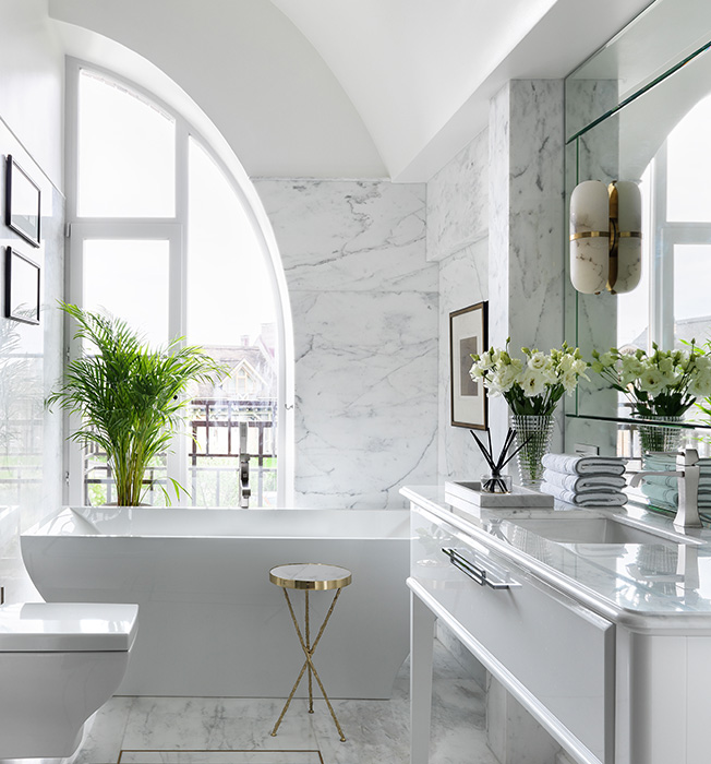 Ванная хозяйки отделана мрамором statuario. «Работа с этим материалом стала для нас огромным удовольствием», — говорят авторы проекта. Столик Ginger & Jagger, Booroom Gallery.