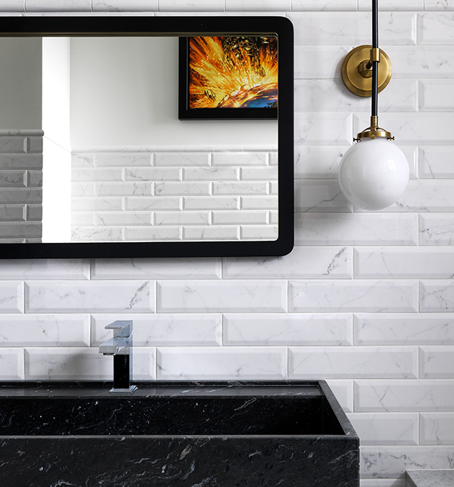 Ванная хозяйки отделана мрамором statuario. «Работа с этим материалом стала для нас огромным удовольствием», — говорят авторы проекта. Столик Ginger & Jagger, Booroom Gallery. Бра Kelly Wearstler.