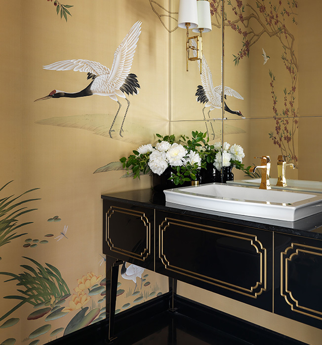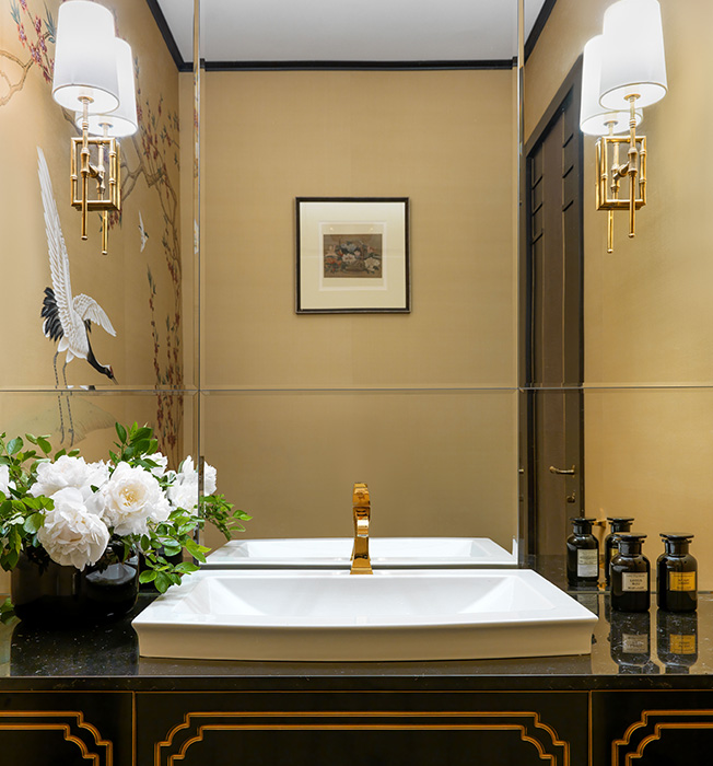 Гостевой санузел. «В нашу концепцию удачно вписались английские шелковые обои De Gournay с ориентальным рисунком: они позволили превратить помещение в изысканную золотую шкатулку», — говорят авторы проекта.