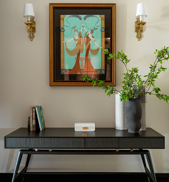 Еще когда обсуждали будущий интерьер, приобрели три винтажные шелкографии китайской художницы Лилиан Шао, повлиявшие на палитру: в них есть оттенки лазури и бирюзы, которые так любит заказчица. А вот от зеленого на стенах Майя и Виктория клиентку отговорили: в сочетании с выбранными оттенками мебели и темным полом он делал интерьер «простым» и недостаточно светлым.