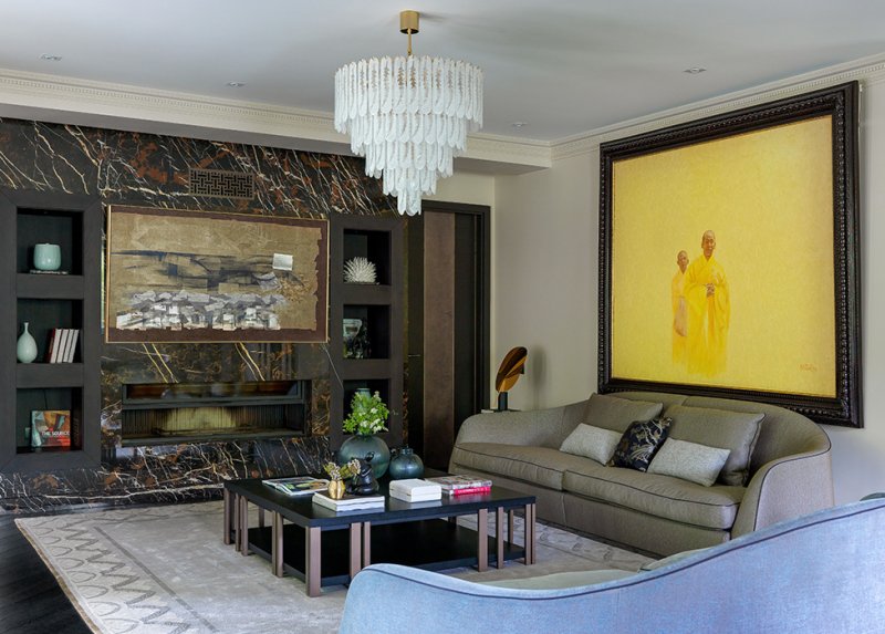 Гостиная. Стеллаж и каминный портал разработаны специально для проекта. В отделке использован мрамор Black and Gold. Диваны Flexform, столик Casamilano, люстра Bella Figura, настольная лампа Flos. На стене работа на меди неизвестного вьетнамского художника. Над камином — японская живописная абстракция.