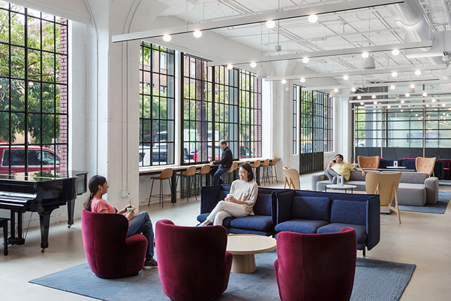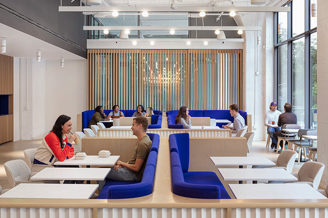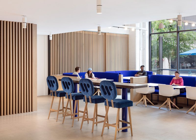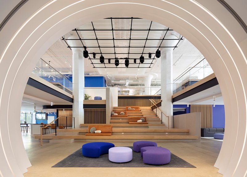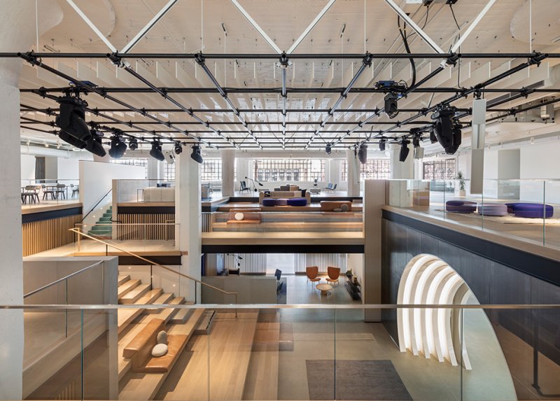 Минималистичная мебель, включая кресла для отдыха, общие столы и сидения расположены на высоте барной стойки вдоль окон; такая схема подходит для различных видов работ. Обшивка из беленого дуба с синими и фиолетовыми акцентами создают теплый контраст с оригинальным бетонным напольным покрытием здания. На уровне мезонина есть места для отдыха, а также бильярдный стол, стол для пинг-понга и др.