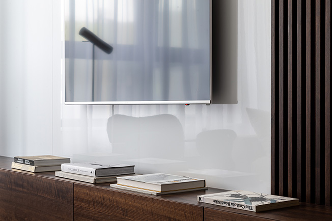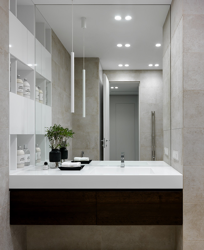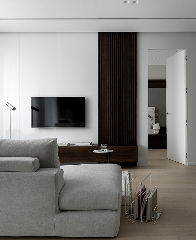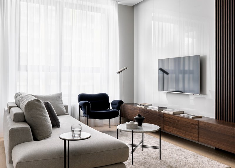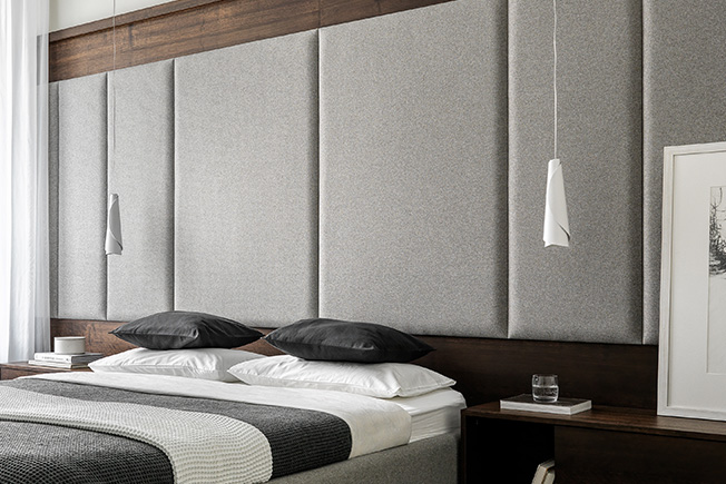 Жилое пространство мы постарались объединить и визуально расширить за счет больших светлых поверхностей и спокойных фактур. Контрастом выступили элементы из темного дерева, они добавили в композицию интересный акцент. Структуру элементов, рисунок дерева, рельеф реек хочется рассматривать, они приятны для глаза. В спальне у нас заиграло сочетание темного дерева и панелей, обтянутых тканью. Оно транслирует уют и сдержанность, характерные для интерьера в целом.
