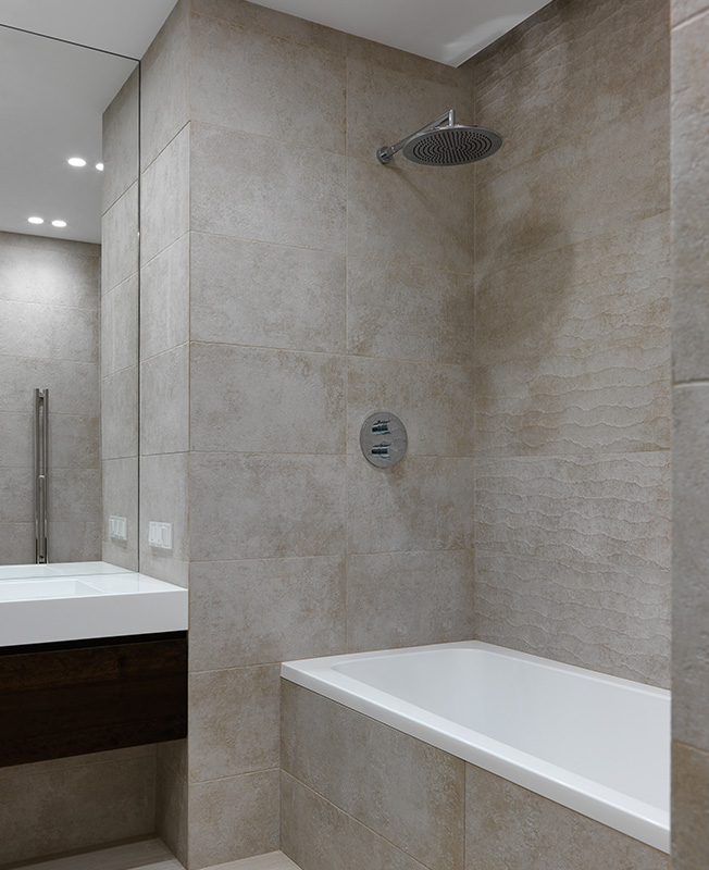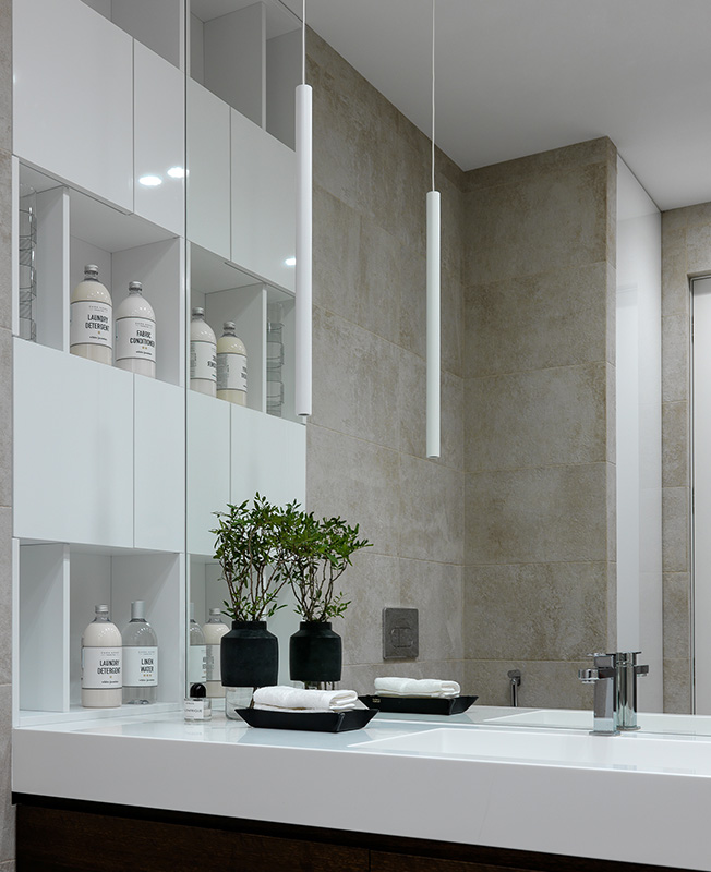 В кухне мы отказались от традиционного фартука и уложили керамогранит по всей стене до потолка. Верхние шкафы уменьшили и расположили ассиметрично, тем самым избавившись от обычной громоздкости этой зоны. В гостиной облегчили диван, убрав один подлокотник, теперь на него можно садится с разных сторон. Стена в зоне гостиной глянцевая: отражающая поверхность расширяет пространство и сочетается с лакированным фасадом кухни.