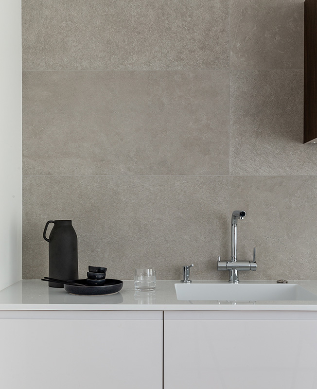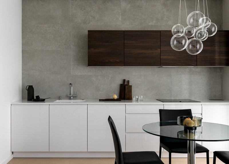 Архитектор отказался от традиционного фартука в кухне: вся стена до потолка отделана керамогранитом Ceramiche Piemme.
