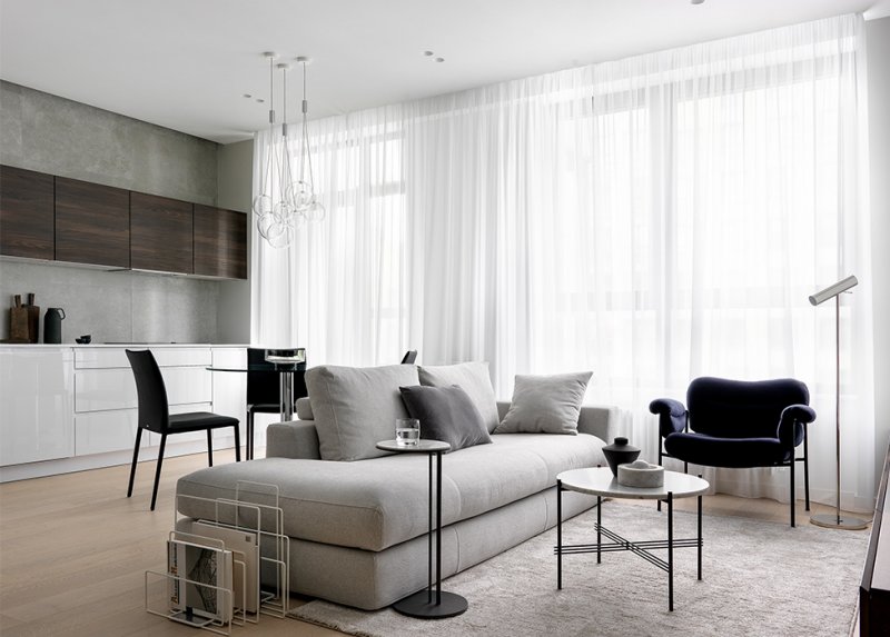 Квартира совсем не выглядит «малогабаритной». Кухня объединена с гостиной, диван Ditre Italia выступает в роли зонирующего элемента.