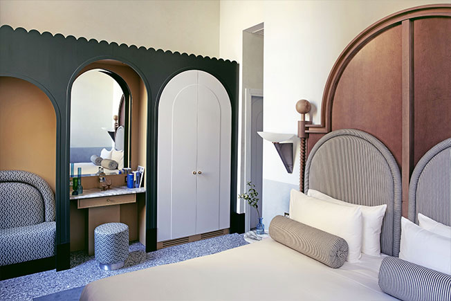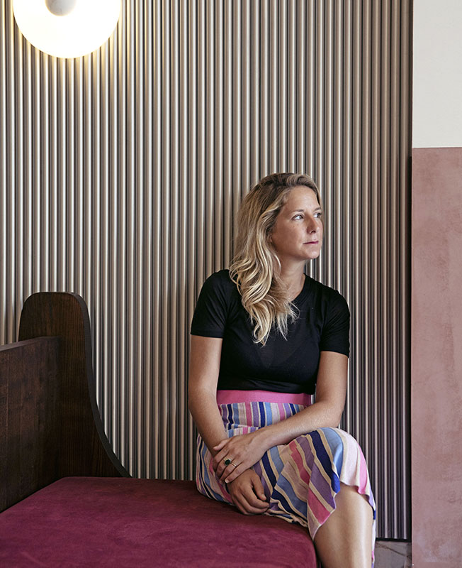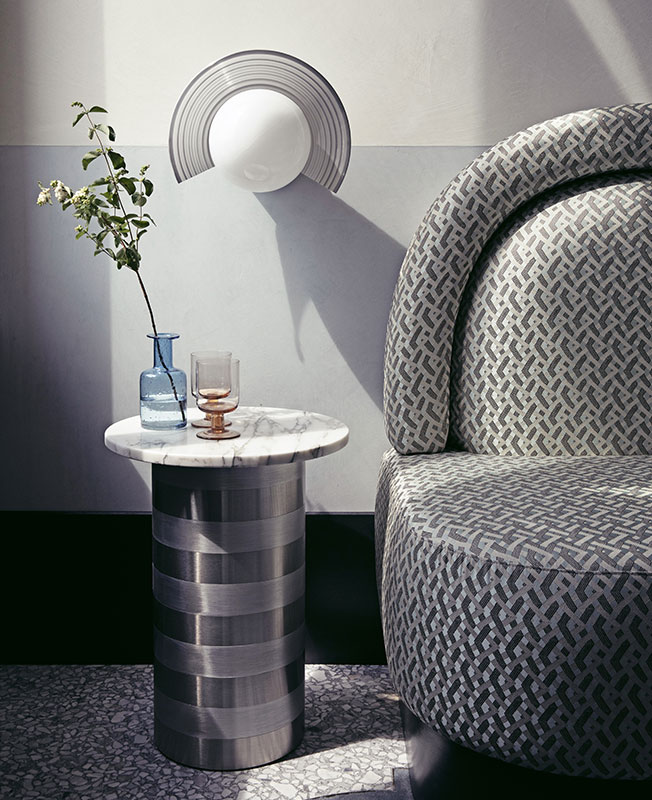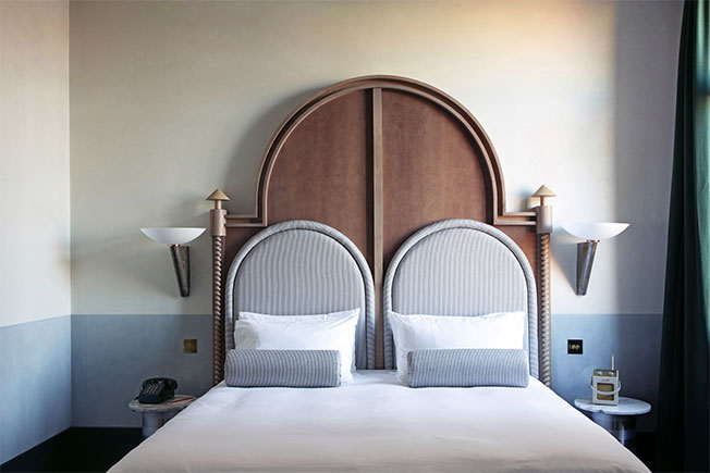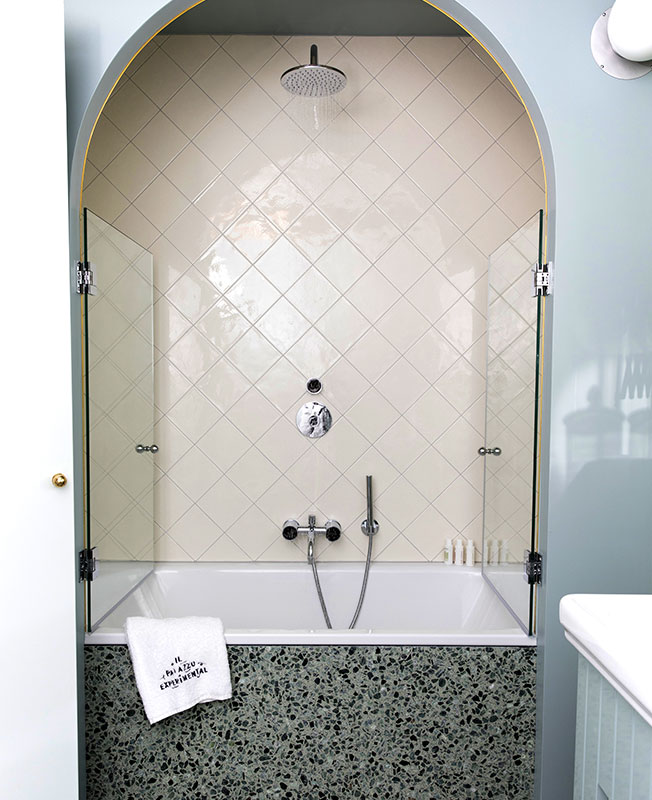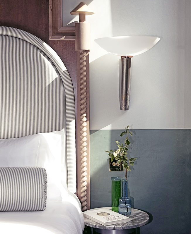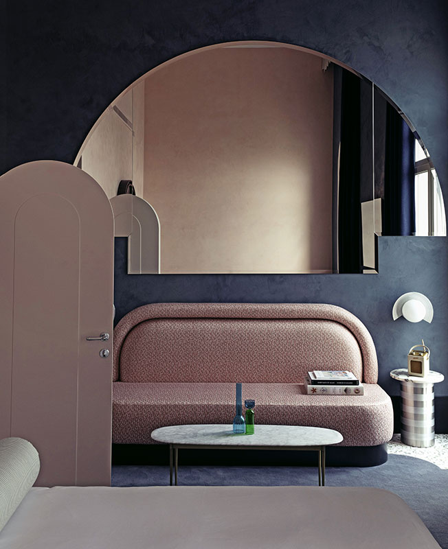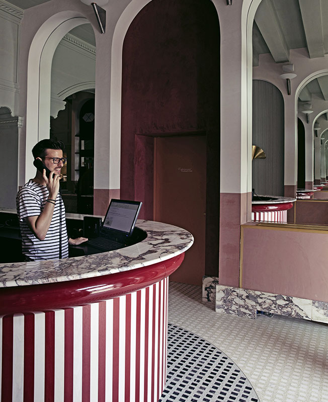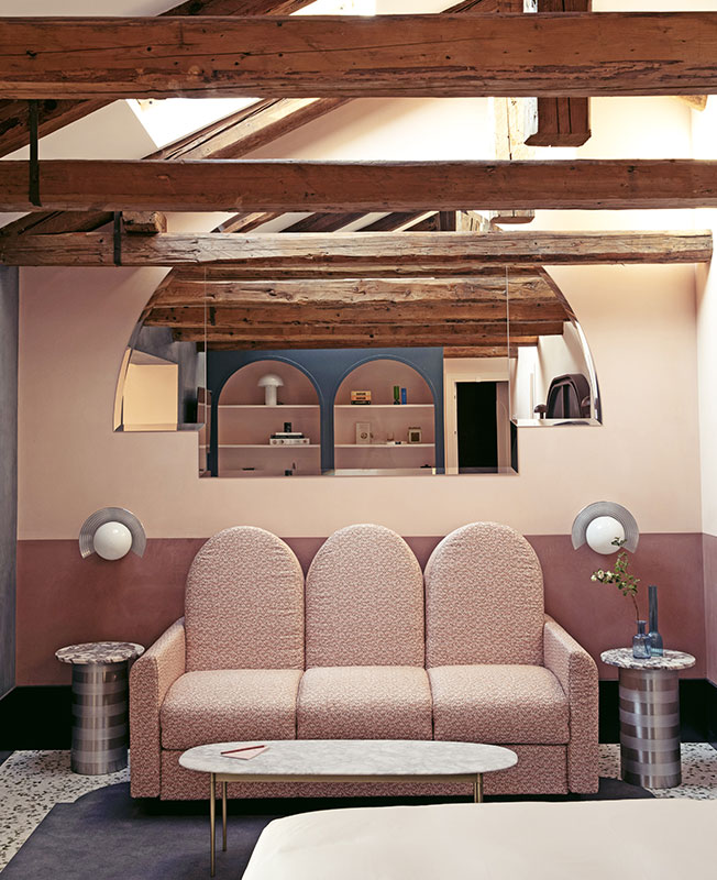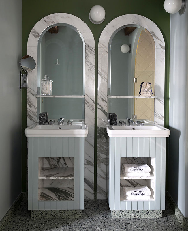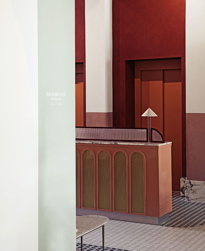 «Мы работали над интерьером отеля и ресторана, используя классические венецианские элементы, которые мы любим, — рассказывает Доротея, — но с внедрением более современных элементов, таких как объекты в стиле «Мемфис». Мы выбрали яркие цвета, стеклянные светильники от Luciano Vistosi, мрамор Breccia Capraia, глазурованную вручную плитку, оформили проемы арками…