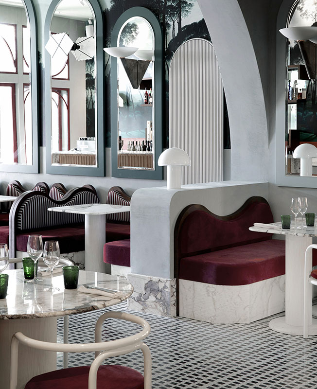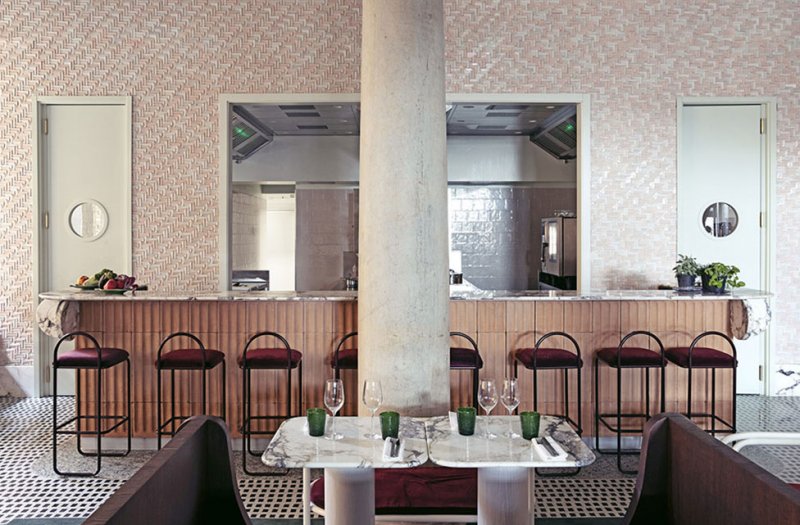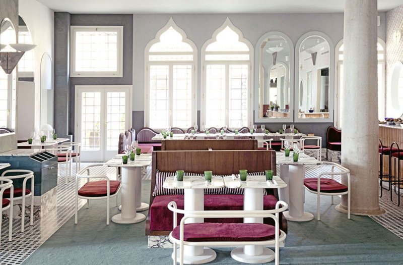 Доротея Мейлихзон выбрала для ресторана потрясающий бледно-зеленый оттенок в духе вод венецианской лагуны, несколько оттенков белого, лососево-розового, бордо и бледно-зеленого.