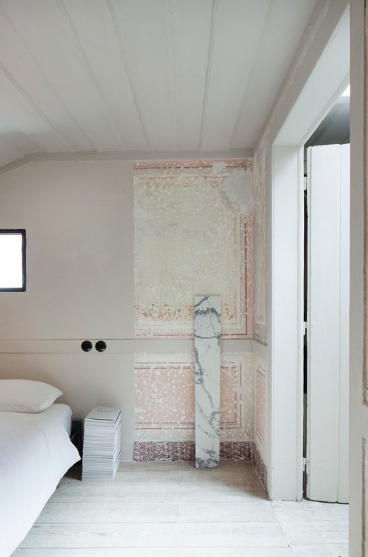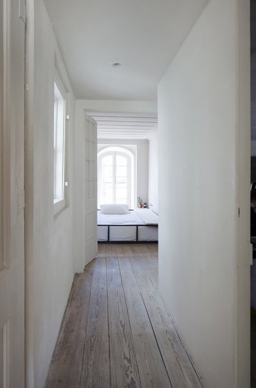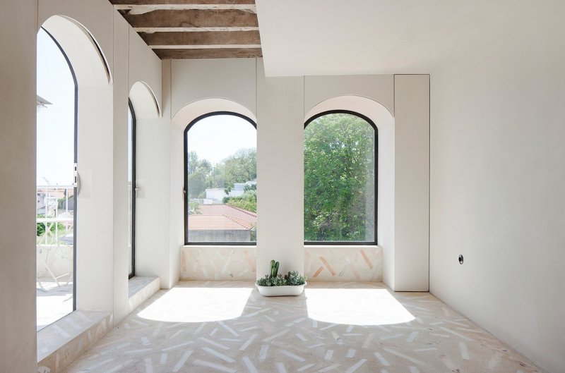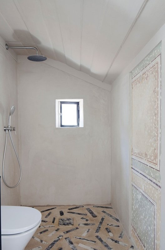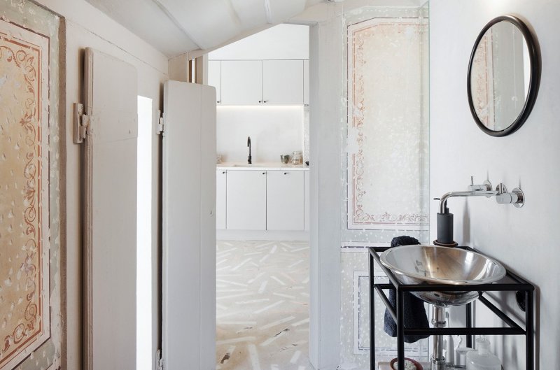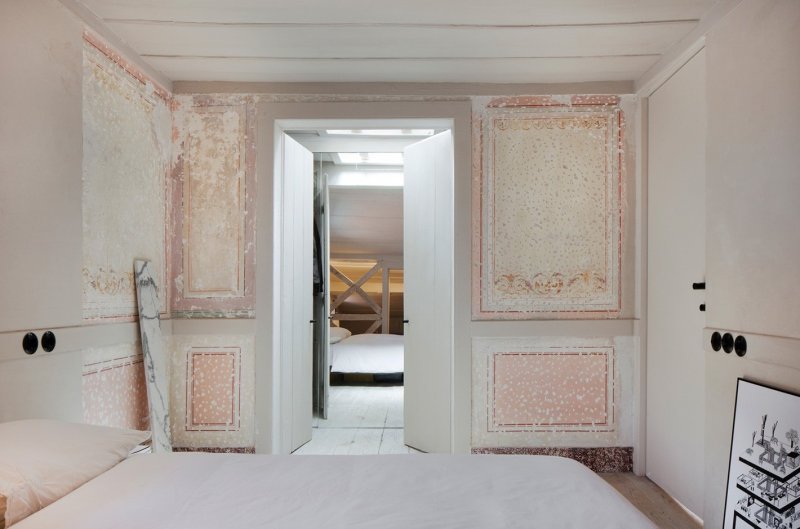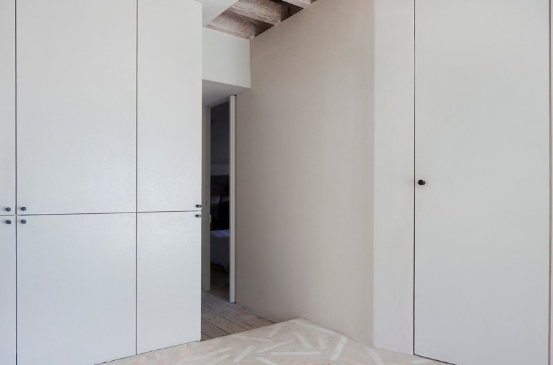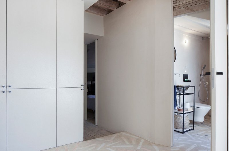 Коридор делит пространство на две зоны: частную и общественную. Общая зона включает открытую кухню-гостиную, ванную комнату и террасу, в частной расположена маленькая спальня. Вдоль кровати проходит маленький деревянный мостик, по которому можно выйти на балкон. Стены, покрытые штукатуркой, служат фоном, на котором выступают исторические фрагменты интерьера — старинные фрески и деревянные потолки. На полу в частной зоне — оригинальные деревянные сосновые доски, а пол в общественной зоне покрыли терраццо — оммаж средиземноморской традиции украшать бетоном с осколками мрамора веранды и террасы.