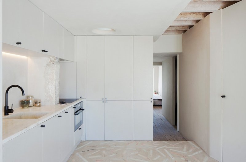 Эта небольшая квартира расположена на пятом этаже здания, построенного в 1819 году, в характерном для Португалии того времени архитектурном стиле помбалино (смесь позднего барокко и классицизма). Архитектор намеренно решил сохранить исторические элементы интерьера, умело соединив их оригинальными современными решениями. Локация: Лиссабон, Португалия Архитектор: Жоао Гамейро Фотограф: Тьяго Казанова Коридор делит пространство на две зоны: частную и общественную. Общая зона включает открытую кухню-гостиную, ванную комнату и террасу, в частной расположена маленькая спальня. Вдоль кровати проходит маленький деревянный мостик, по которому можно выйти на балкон. Стены, покрытые штукатуркой, служат фоном, на котором выступают исторические фрагменты интерьера — старинные фрески и деревянные потолки. На полу в частной зоне — оригинальные деревянные сосновые доски, а пол в общественной зоне покрыли терраццо — оммаж средиземноморской традиции украшать бетоном с осколками мрамора веранды и террасы. Мы разбираем интерьеры - подробно! Чтобы вы могли лучше понимать, на чем строится хороший интерьер, чтобы учились у лучших. Подготовка такого материала требует времени, а интерьеров много. Помогите нам выбрать самые достойные - проголосуйте ЗА интерьер, если вам хочется увидеть его в расширенной публикации и узнать детали создания.