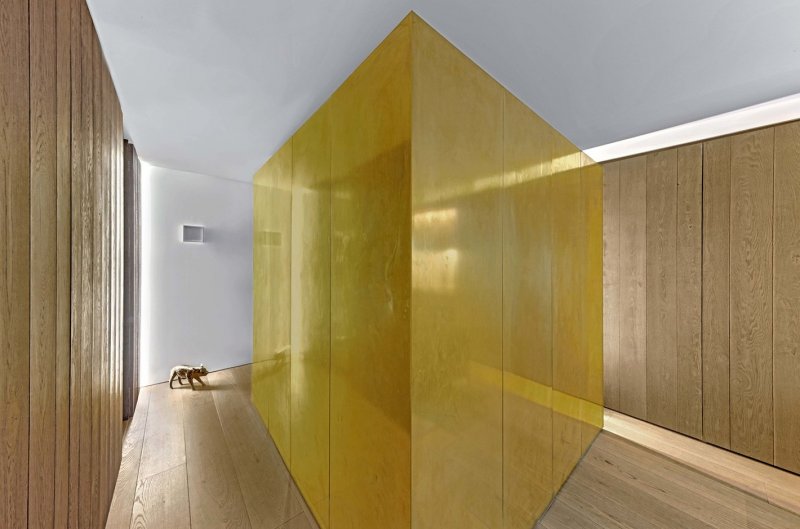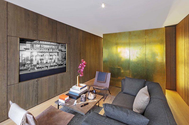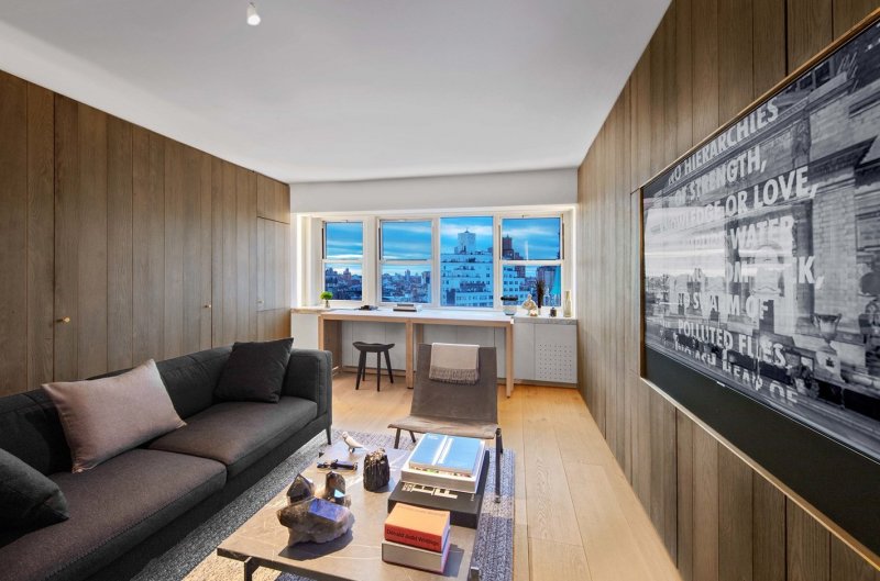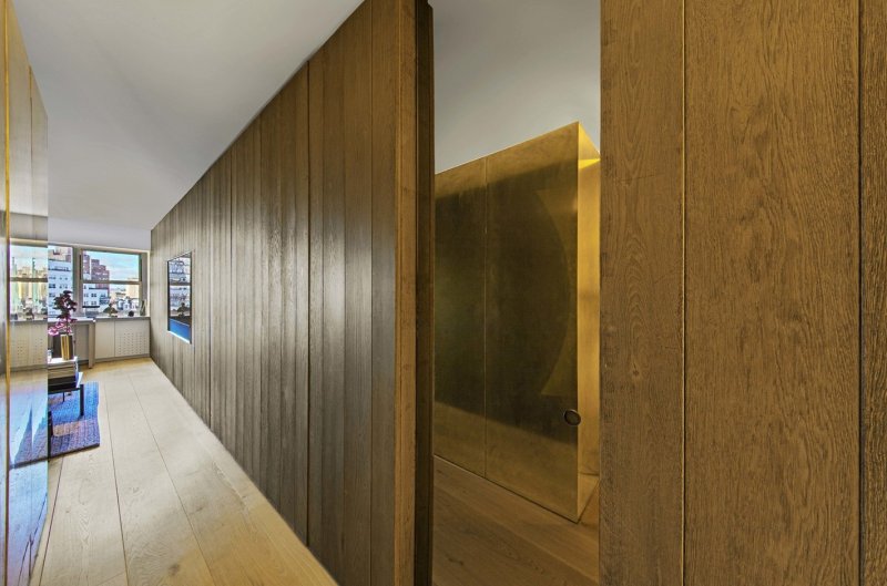 Квартира расположена в однообразном здании из белого кирпича, построенном в 1957 году и переоборудованном в кооперативное жилье в 1983 году. Окна выходят на запад, отрывая впечатляющий вид на город. Убрав все существующие в квартире перегородки, архитектор разместила вдоль северной и южной стен шкафы из европейского дуба — кроме прочего, они поглощают шум из соседних квартир. В одном шкафу находятся книги, одежда, аудио-видео-техника и телевизор. В другом — холодильник / морозильник и кухонная зона. Кровать спрятали в обшитый снаружи золотой медью контейнер — внутри он обшит выкрашенной в серый цвет шкурой коровы. Ванная комната облицована каррарским мрамором.