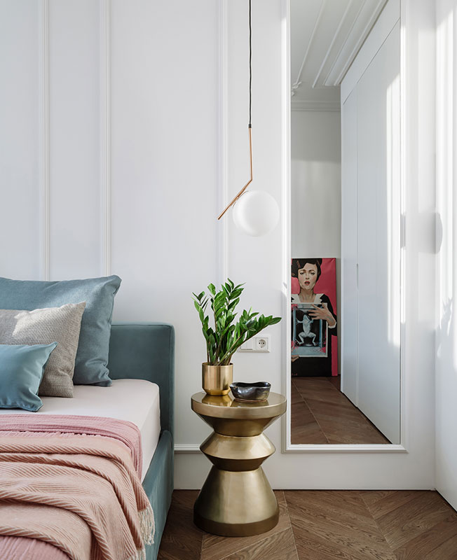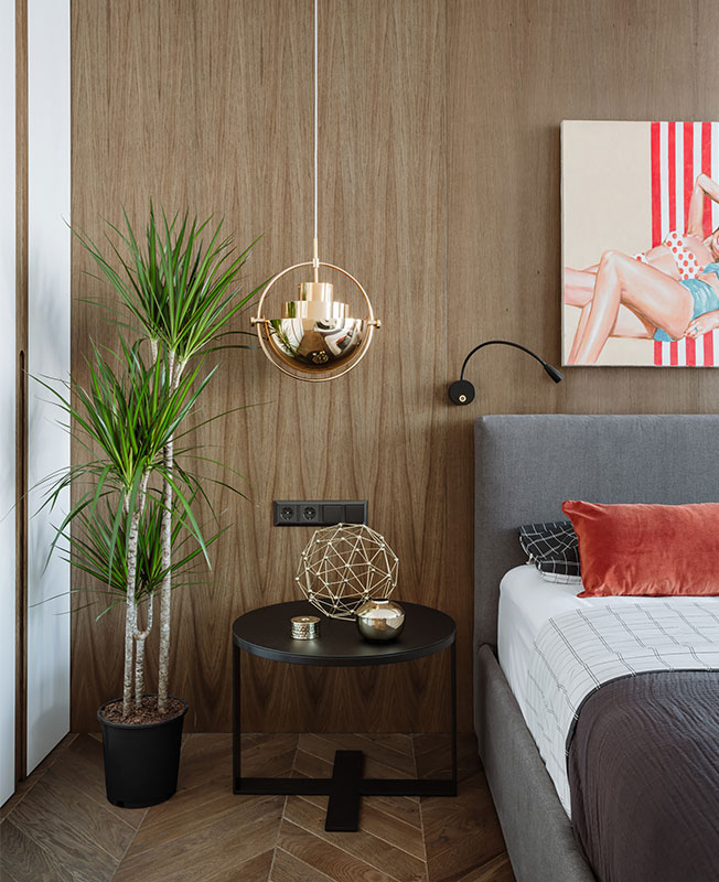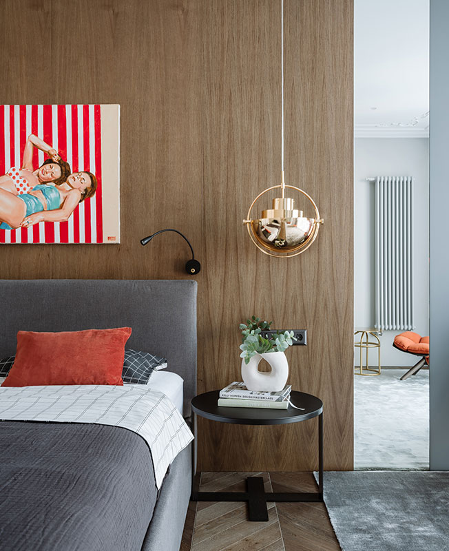 Фрагмент спальни. Прикроватный столик Eileen, диз. Антонио Читтерио, B&B Italia. Подвесной светильник Gubi. Над изголовьем картина «На пляже» Анны Красной. Инженерная доска Finex. Декор Home Collections.