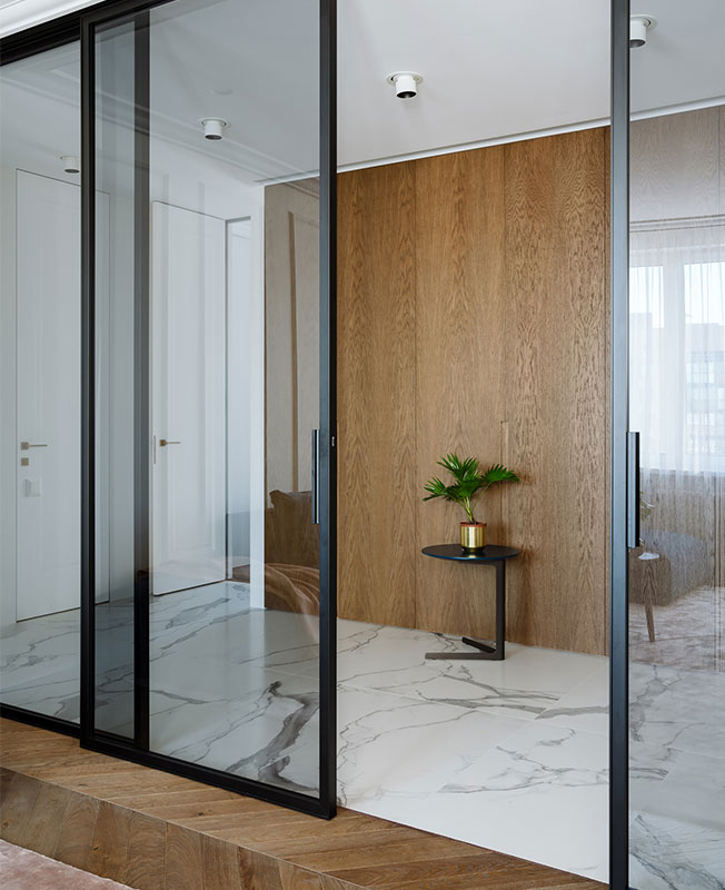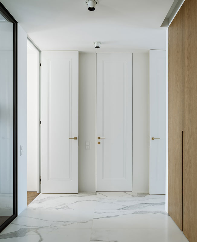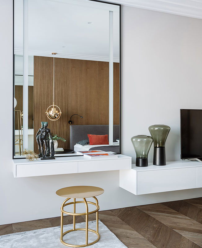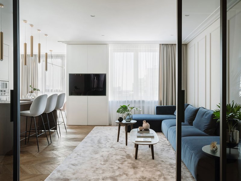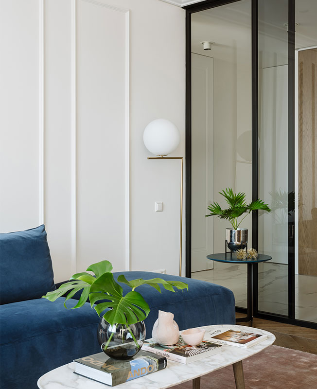 Молдинги на стенах, стеклянная перегородка между гостиной и коридором, двери и фасады с тонкими рамами, врезные ручки на шкафах в спальне, вертикальные радиаторы, тонкие аскетичные светильники Майкла Анастасиадиса для Flos — все эти приемы работают на визуальное вытягивание пространства.