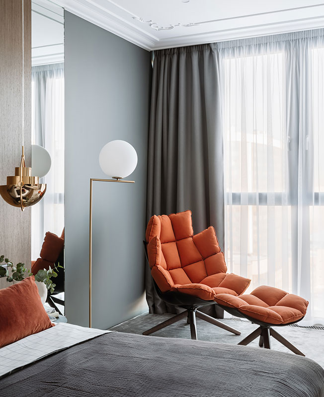 Фрагмент спальни. Кресло с пуфом Husk, диз. Патрисия Уркиола, B&B Italia. Напольный светильник IC Lights, диз. Майкл Анастасиадис, Flos. Краска Little Greene.