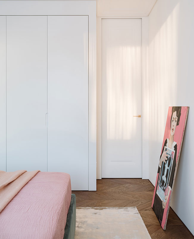 Фрагмент гостевой спальни. Шкаф выполнен на заказ по эскизам автора проекта. На полу картина Анны Красной. Инженерная доска Finex.