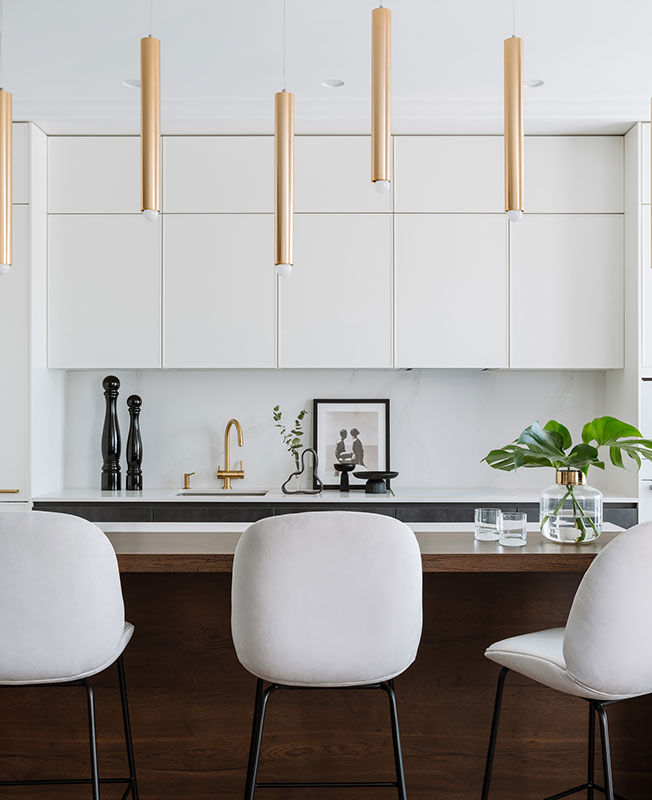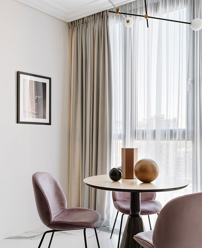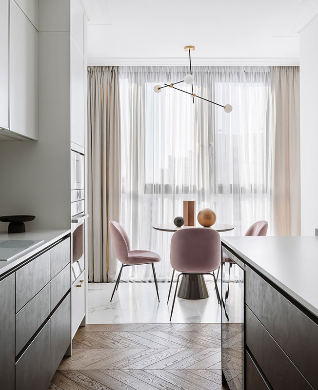 В квартире дизайнер использовала много предметов датской марки Gubi. В обеденной зоне и на кухне — стулья Beetle, которые прочно укоренились в проектах отечественных дизайнеров, а также каноничные подвесные светильники Multi-Lite, которые были придуманы архитектором Луи Вейсдорфом (Louis Weisdorf) еще в 1972-м году. При перемещении абажуров создается как рассеянное, так и направленное освещение.