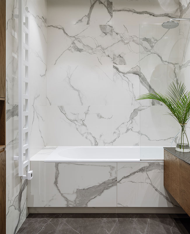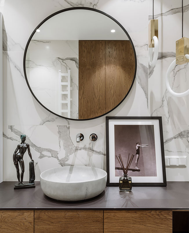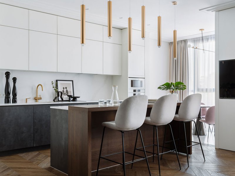 «В этом проекте я использовала действительно много дерева: здесь и инженерная доска на полу с раскладкой «елочка», и шкафы, и настенные панели. На кухне применили оригинальное сочетание бетона, мрамора и классических фасадов с тонкой рамкой. Также я использовала везде одну плитку, чтобы интерьер выглядел целостно», — рассказывает о проекте дизайнер.