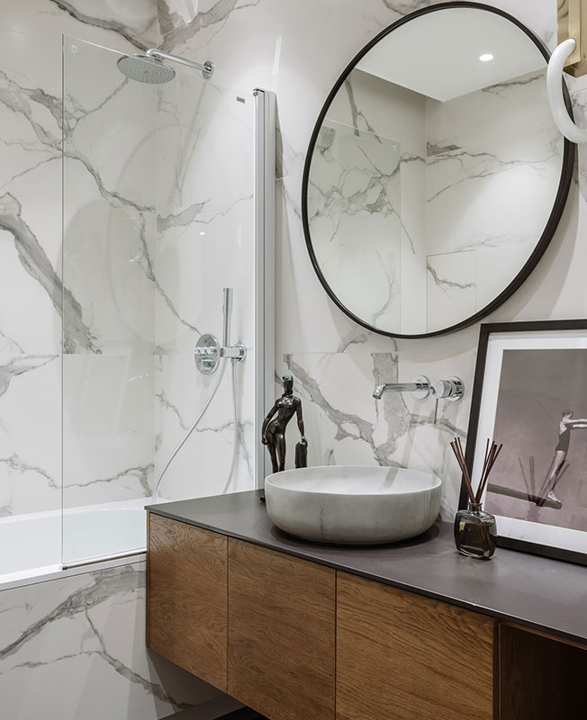 Ванная комната. Ванна Villeroy&Boch. Плитка I Classici di Rex. Смесители Grohe. Тумба выполнена на заказ по эскизам автора проекта. Раковина BetON. Декор Home Collections.