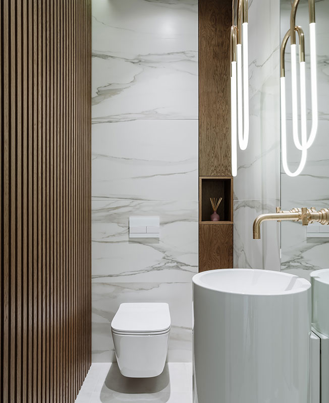 Планировка не подразумевала серьезных изменений. В квартире сформировали просторную кухню-гостиную со столовой зоной, главную и гостевую спальню, ванную комнату и санузел. Концептуальными материалами интерьера стала натуральная древесина и мрамор.