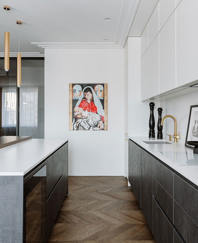 Кухня Hacker Kuchen. На стене картина «Мадонна с младенцем» Анны Красной. Инженерная доска Finex. Краска Little Greene.