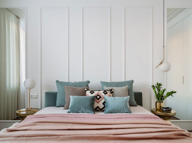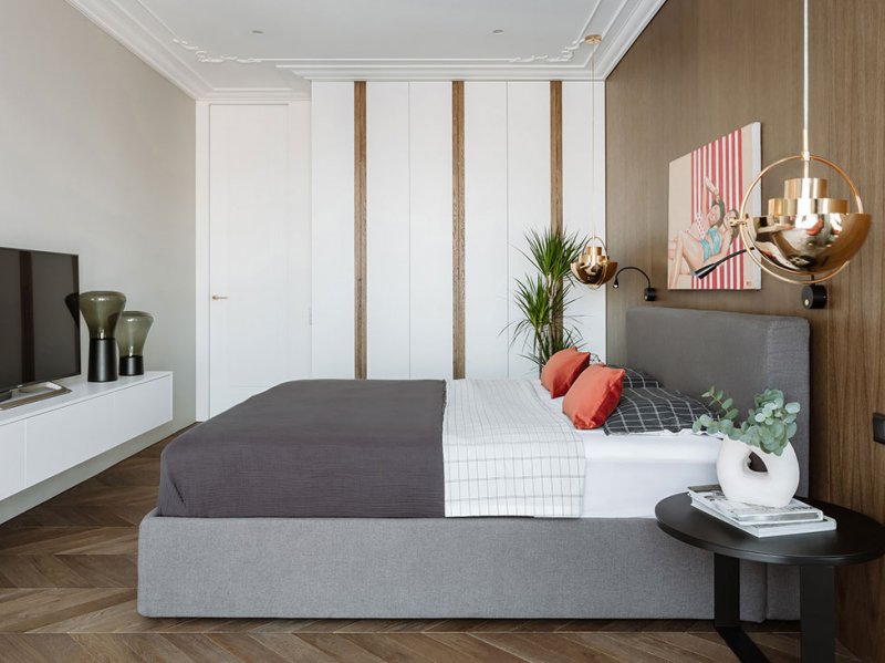 Фрагмент спальни. Тумба выполнена на заказ по эскизам автора проекта. Инженерная доска Finex. Краска Little Greene. Декор Home Collections.