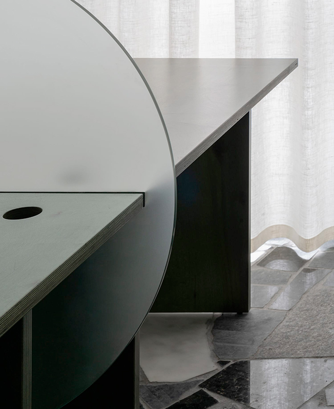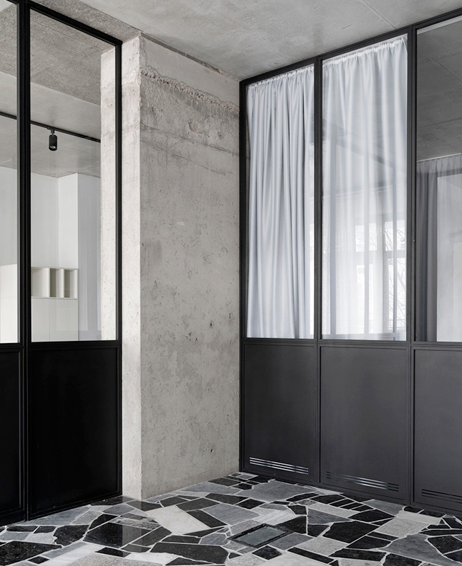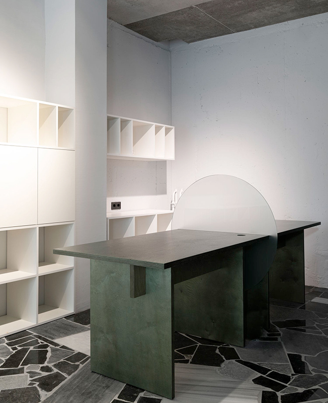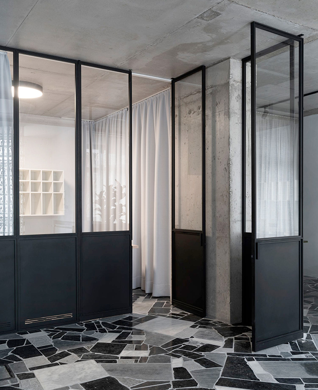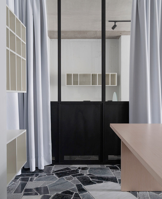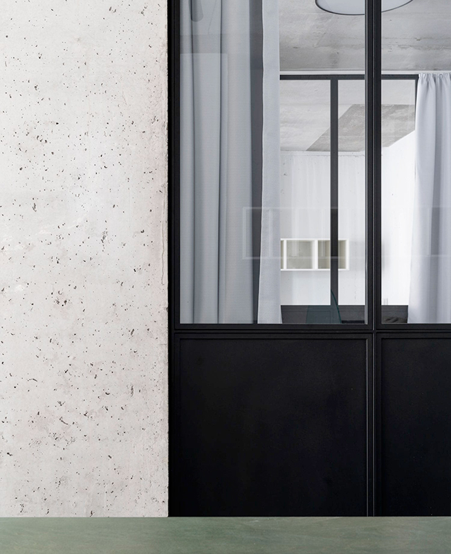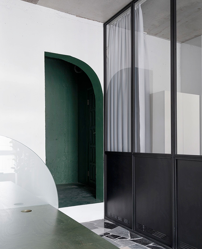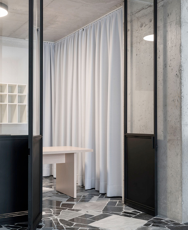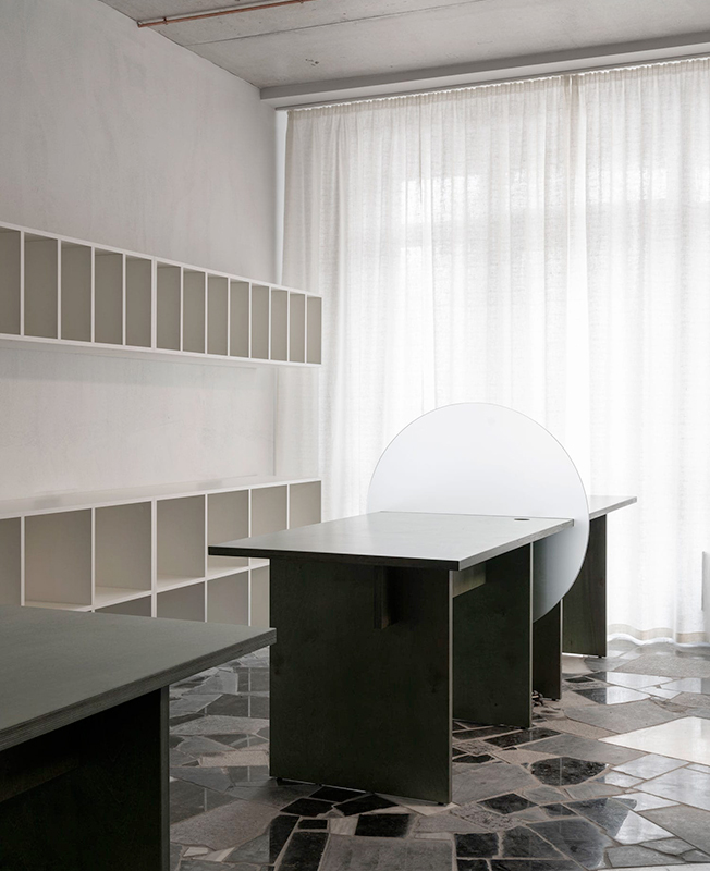 Большинство материалов, используемых во всем интерьере, натуральные. Эффектное терраццо в оттенках черного, серого и белого на полу имеет в основе крупные куски мрамора. Рабочие столы сделаны из фанеры зеленого оттенка. Стены покрыты грубой штукатуркой, а бетонный потолок оставили без отделки. Свет, проникающие через три больших панорамных окна, рассветивают тонкие льняные шторы. Остальная часть интерьера освещается архитектурными светильниками.