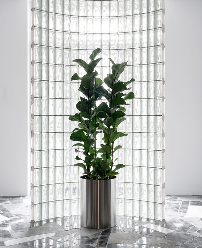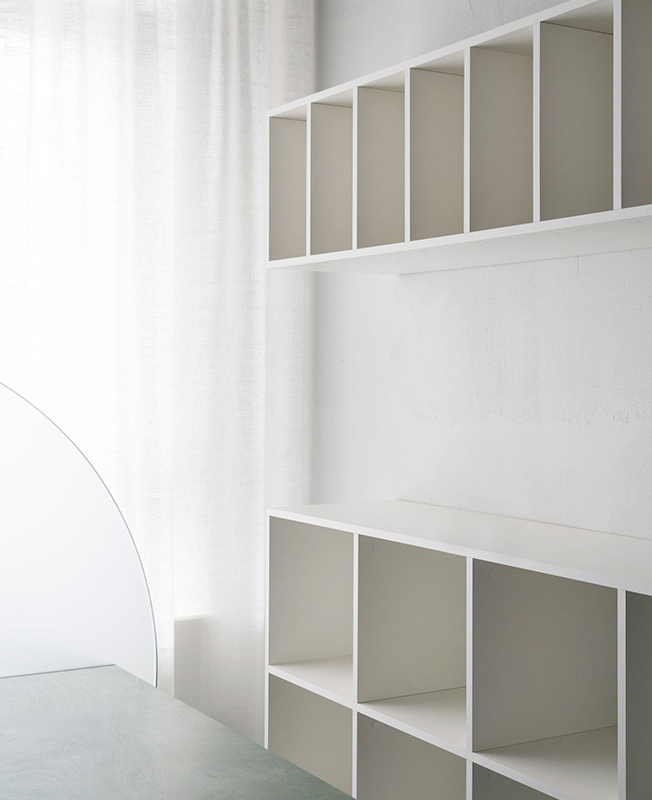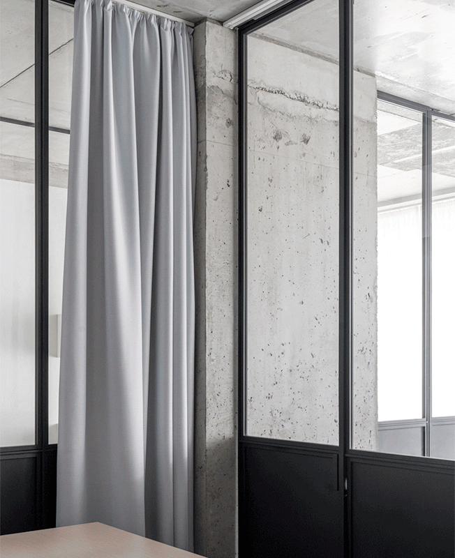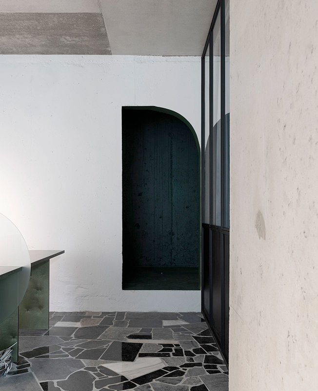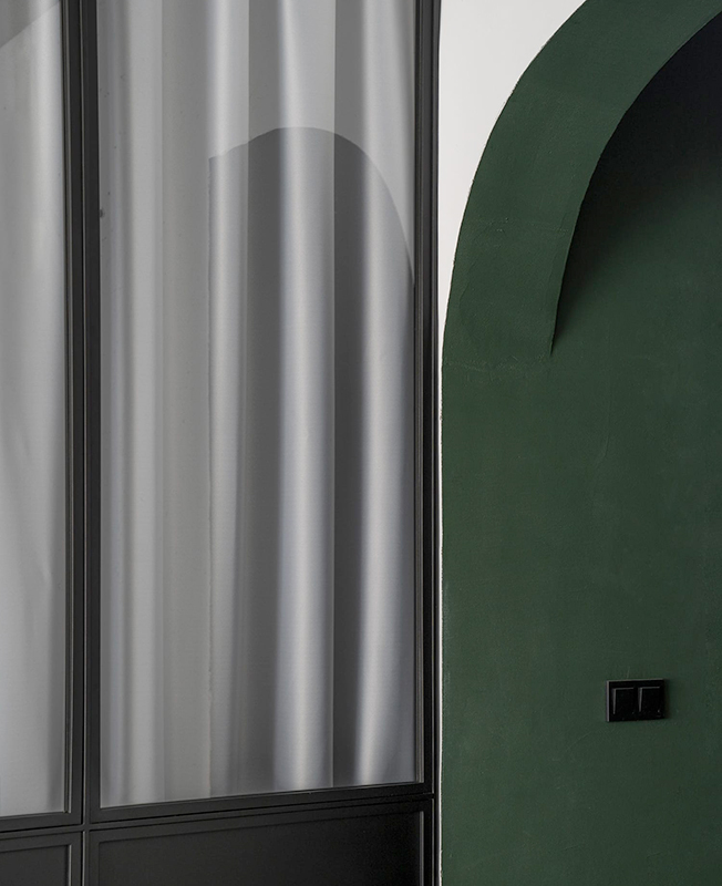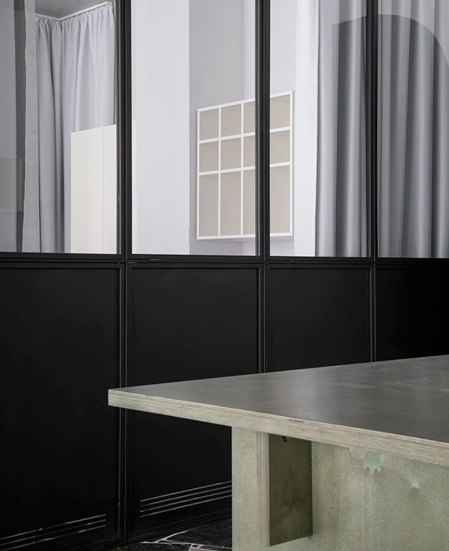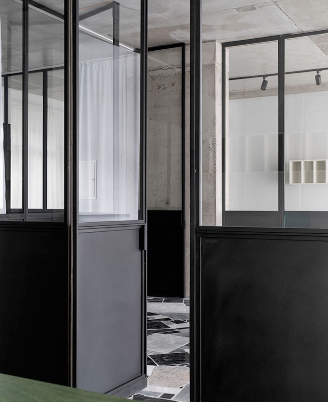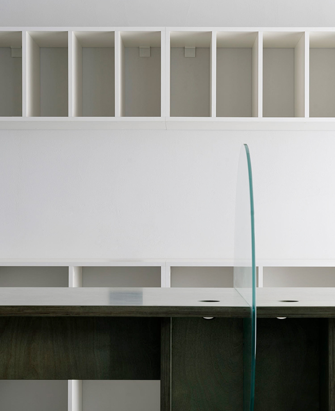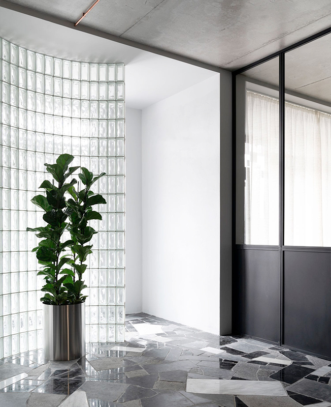 Большинство материалов, используемых во всем интерьере, натуральные. Эффектное терраццо в оттенках черного, серого и белого на полу имеет в основе крупные куски мрамора. Рабочие столы сделаны из фанеры зеленого оттенка. Стены покрыты грубой штукатуркой, а бетонный потолок оставили без отделки. Свет, проникающие через три больших панорамных окна, рассветивают тонкие льняные шторы. Остальная часть интерьера освещается архитектурными светильниками.