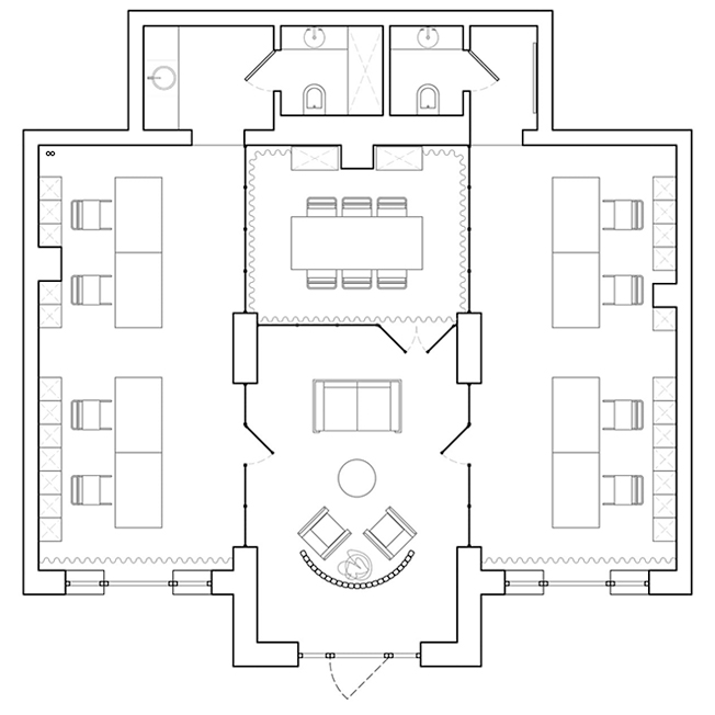 «Мы попытались создать пространство с очень простой и понятной планировкой, где все действия происходят за прозрачными перегородками, а не за закрытыми дверями», — говорит Ия Турабелидзе.