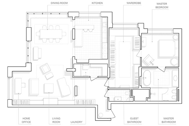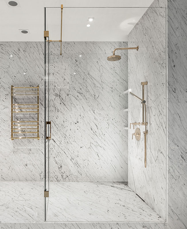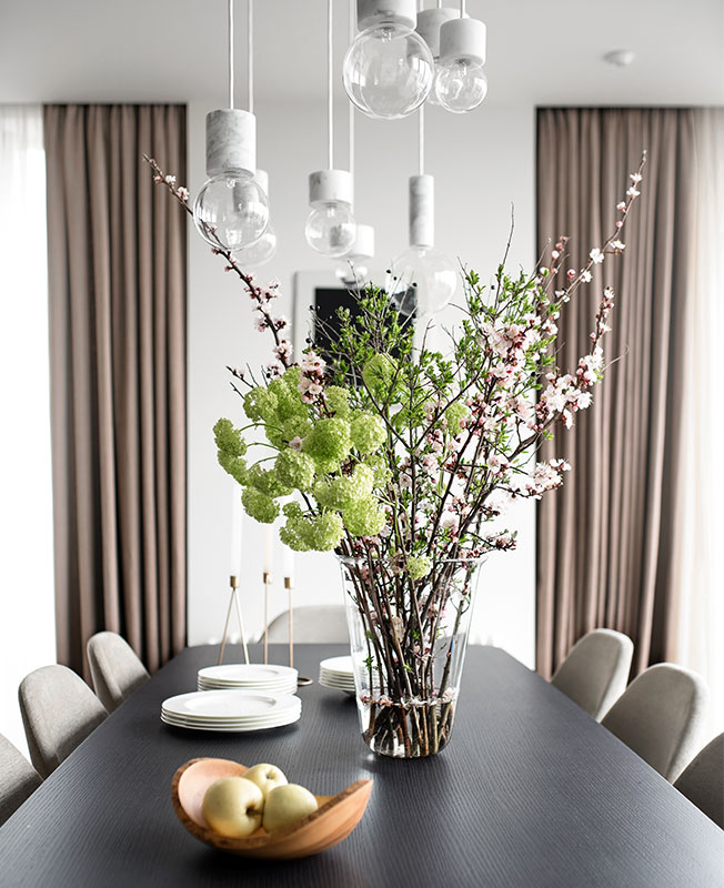 В интерьере обращают на себя внимание фактуры и акценты. В зоне кухни контрастные фасады шкафов дополнены мраморными столешницами, латунными ручками и глянцевой плиткой Mutina. Все здесь располагает к готовке в удовольствие. О гостеприимстве хозяйки говорит и масштабный обеденный стол Винсента ван Дейзена для B&B Italia, дополненный ровными рядами стульев по дизайну Ээро Сааринена — настоящая классика дизайна XX века.