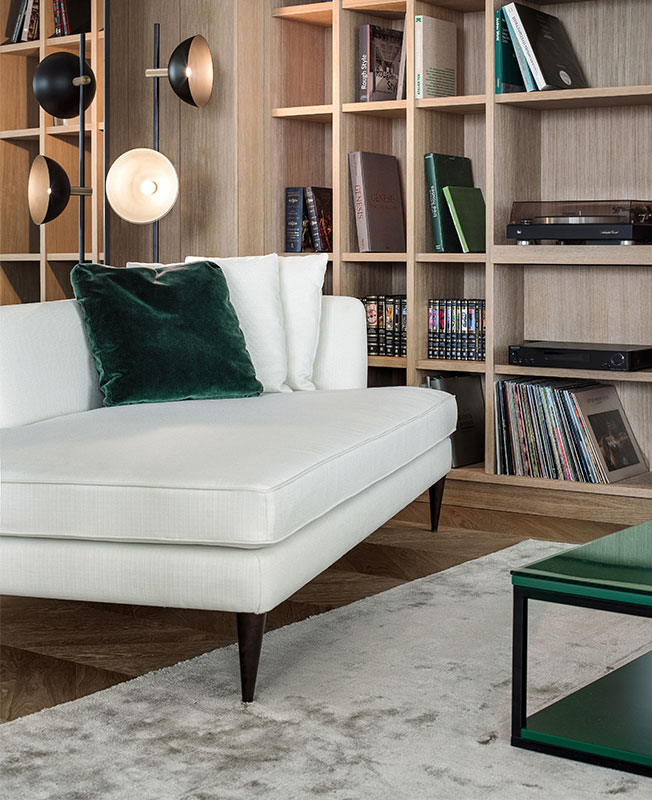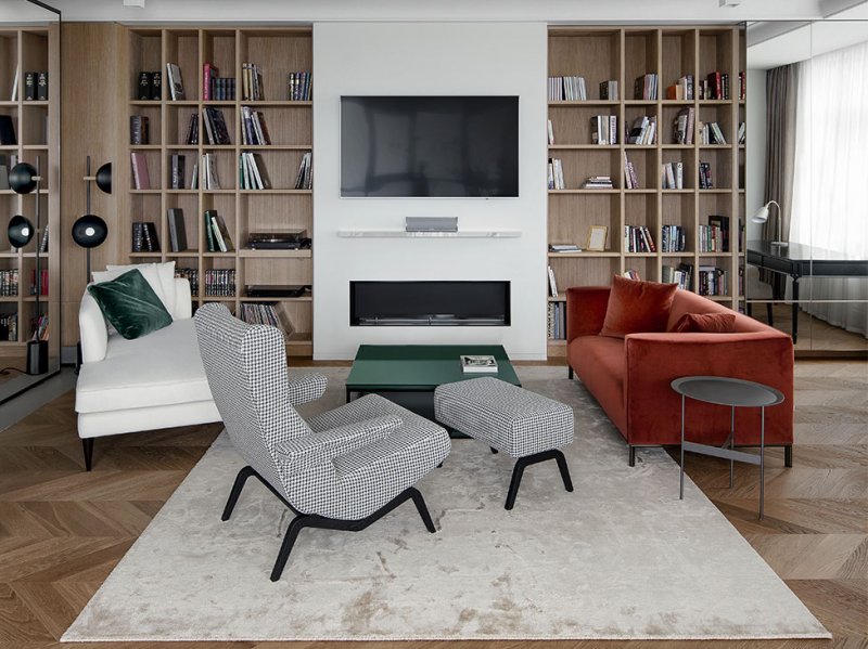 Гостиная. Кресло и пуф Ligne Roset. Диван Breeze, диз. Маттео Нунциати, Molteni&C. Кушетка выполнена на заказ в столярной мастерской. Напольный светильник Handvark studio. Журнальный столик Stalkon. Камин Planika.