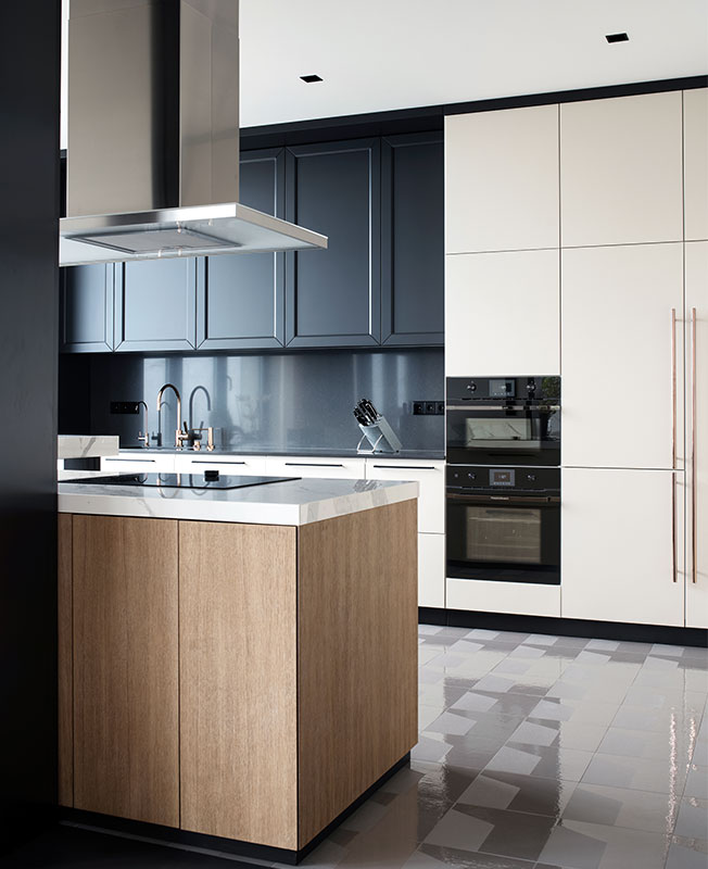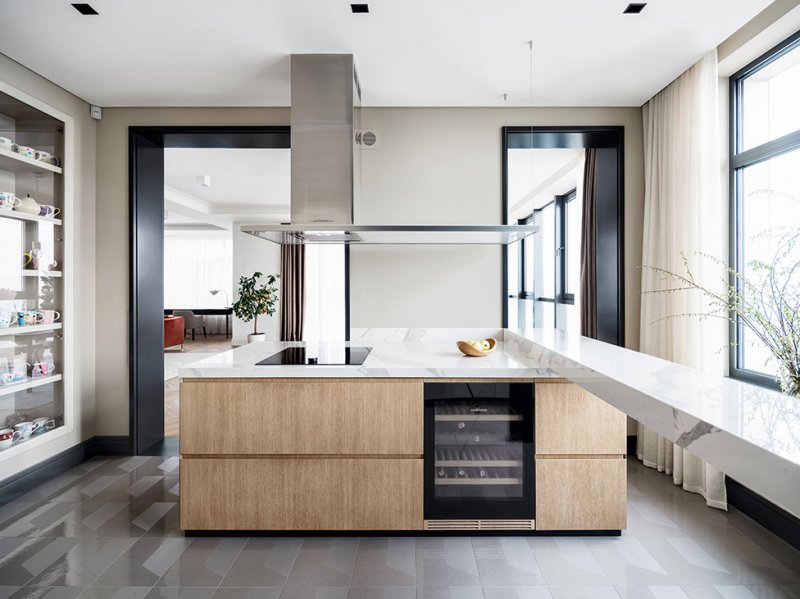 Кухня. Остров выполнен на заказ в столярной мастерской. Вытяжка Falmec. Столешница Vicostone и Laminam. Плитка Mutina.