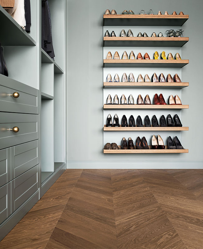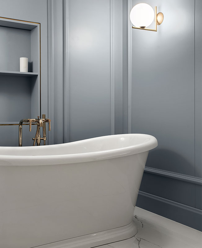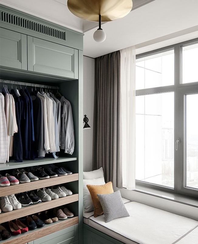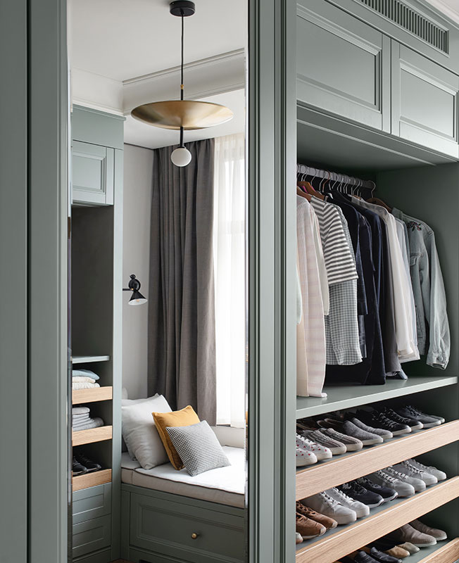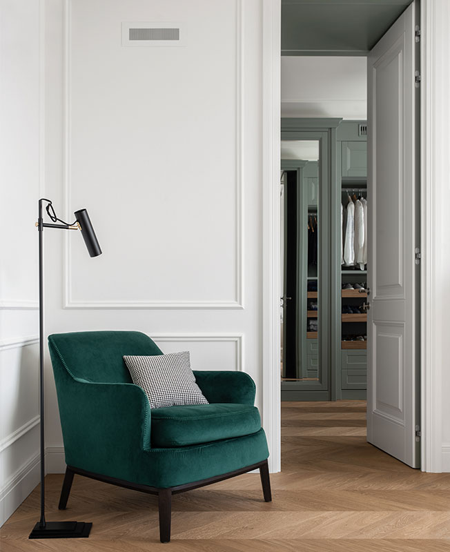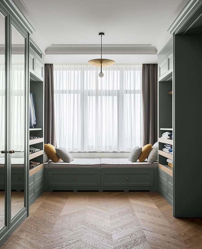 Самая спокойная комната дома — лаконичная спальня с прилегающей ванной в синих тонах с мраморным полом. Отдельного внимания заслуживает гардеробная, исполненная в более строгом классическом духе в пастельной зеленой цветовой гамме. В эркере обустроен уютный уголок с лежанкой.