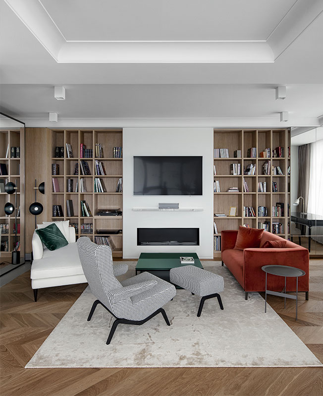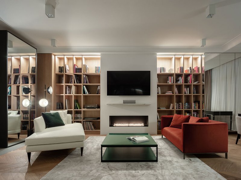 В центре пространства — масштабная гостиная, объединенная с кухней и столовой. Все здесь располагает к отдыху — удобный диван по дизайну Маттео Нунциати для Molteni&C, кресло с пуфом Ligne Roset, множество заставленных книжных полок и, конечно, камин.