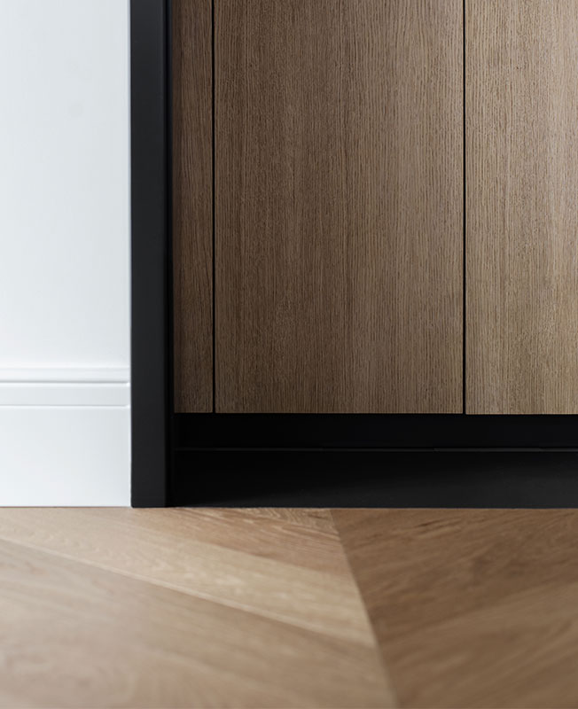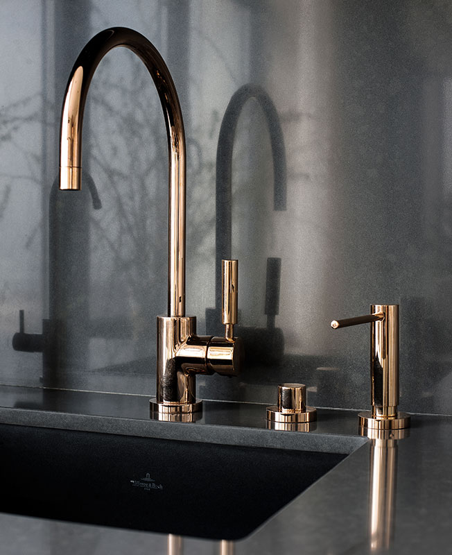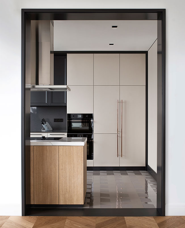 Кухня выполнена на заказ в столярной мастерской. Вытяжка Falmec. Столешница Vicostone и Laminam. Плитка Mutina.