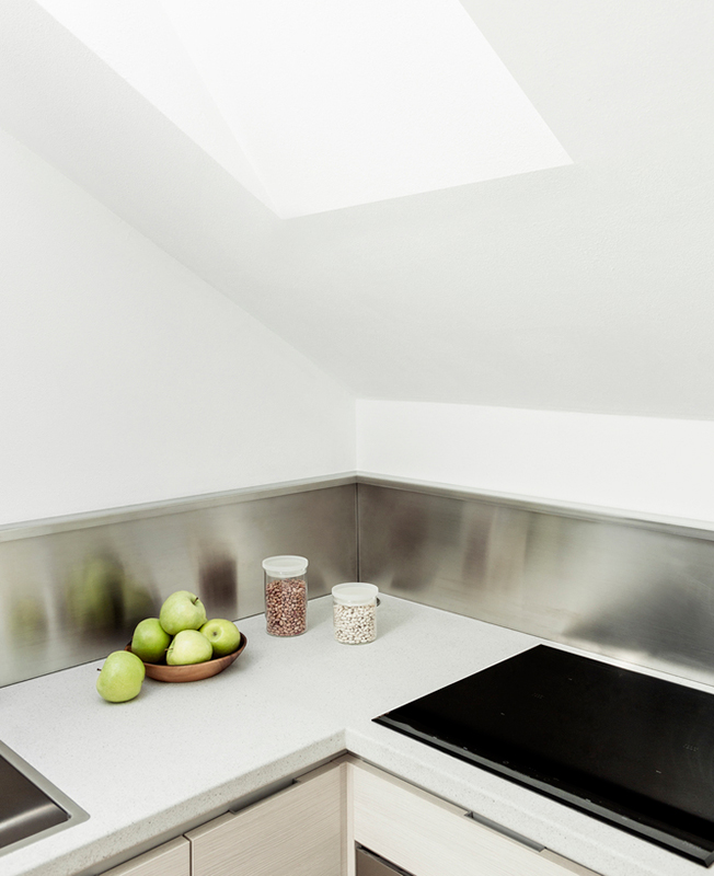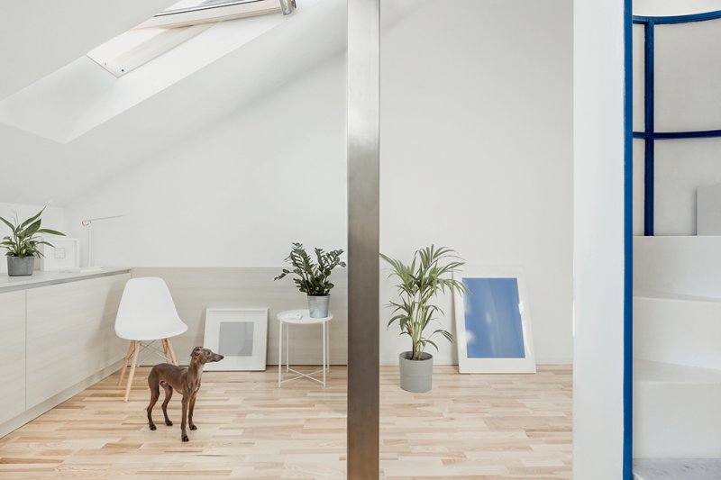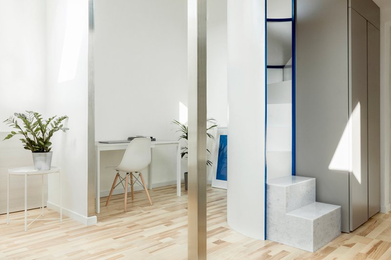 Богдан Перич, Андрей Михалев, Стефано Флорис и Евгения Соколова, студия Untitled Architecture, оформили интерьер на чердаке старого жилого здания в Милане. Тесное и темное помещение превратили в функциональное и светлое. Целью архитекторов было расширить внутреннее пространство и поменять его восприятие, изменив существующую геометрию и увеличив количество естественного света. Начали с того, что увеличили два мансардных окна, которые теперь обеспечивают отличное освещение. Планировка квартиры площадью 30 кв. метров — крестообразная. В ней выделено четыре зоны: гостиная, рабочий уголок, кухня и ванная. Все они собраны вокруг центрального элемента — колонны из нержавеющей стали. Спальня расположена на верхнем, антресольном этаже. Вместе с ванной комнатой внизу она образует отдельный геометрический блок. Уровни соединяет полуцилиндрическая лестница, которая была изготовлена с применением трех простых элементов: натурального мрамора, стали и древесины. Изогнутая форма лестницы ярко контрастирует со строгой геомерией квартиры. Ее линии выделяет окантовка синего цвета из трубчатого металла, которая также подчеркивает непрерывность внутреннего пространства. Мебель в квартире расположена по периметру: с одной стороны, это оставляет больше свободного места в центре, с другой — обеспечивает плавный переход одной зоны в другую. Материалы выбрали максимально нейтральные, чтобы подчеркнуть неправильную геометрию квартиры и визуально объединить разные помещения. Так появились грубая белая штукатурка на стенах и потолке, полы и столешница в ванной из дуба, мебель и раздвижная дверь из светлого дерева. Торцы перегородок и кухонный фартук облицованы панелями из нержавеющей стали — они перекликаются с расположенной в центре помещения колонной. Ванная комната почти полностью оформлена белоснежной плиткой. Синяя затирка создает визуальную связь с конструкцией лестницы. Еще одна особенность санузла — вентиляционная труба из алюминия, которая проходит сквозь антресоль, соединяя эти два пространства.