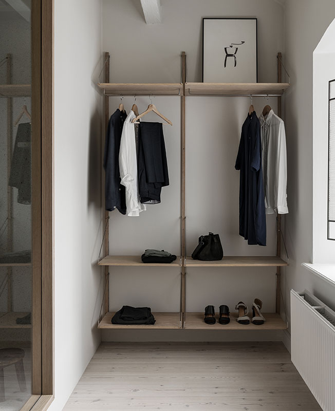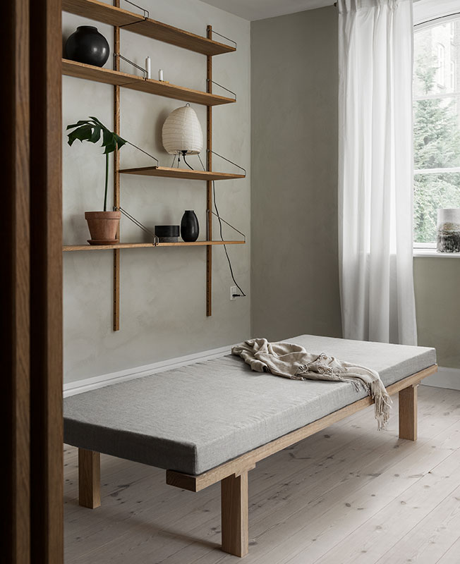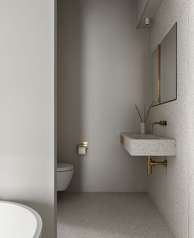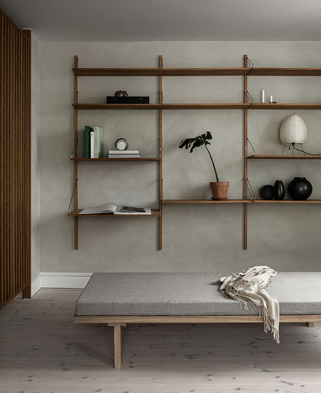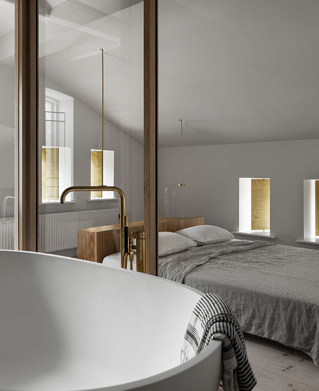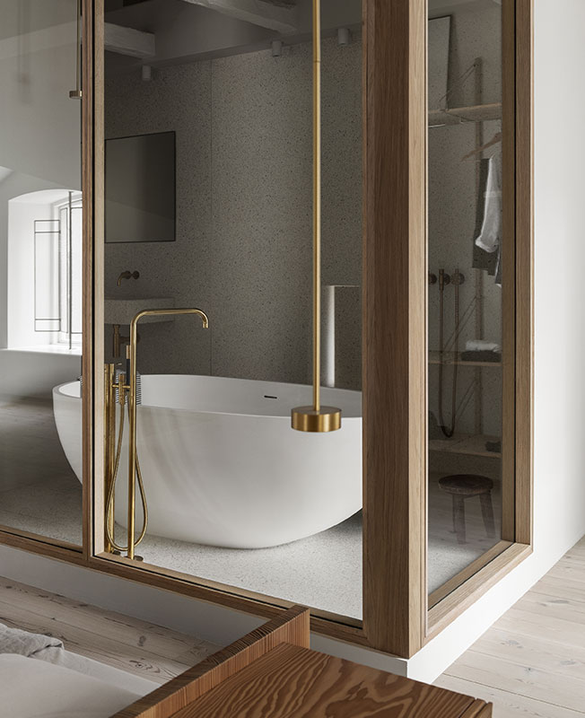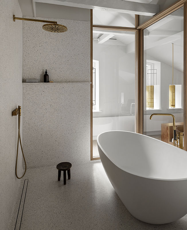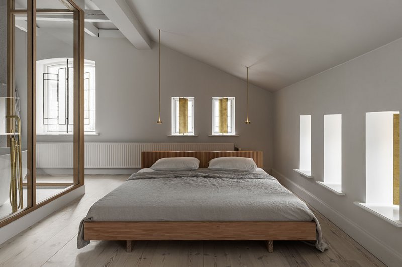 Модульные деревянные стеллажи в интерьере — работа Frama, низкая кровать выполнена из ели Дугласа. В ванной комнате пол и стены отделаны отдним материалом — терраццо. Белоснежная ванна из композита находится словно в стеклянной коробке с деревянным каркасом.