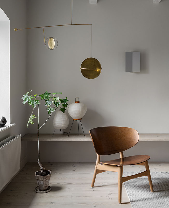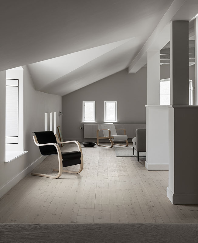 Наклон и открытые балки скатной крыши добавляют геометрии, как и немногие предметы скандинавской мебели, среди которых — знаменитое кресло Paimio финского архитектора Алвара Аалто.