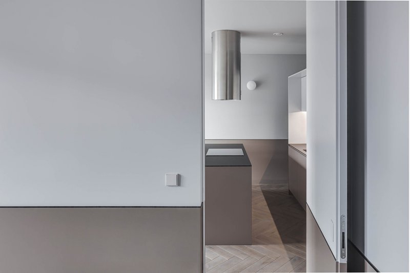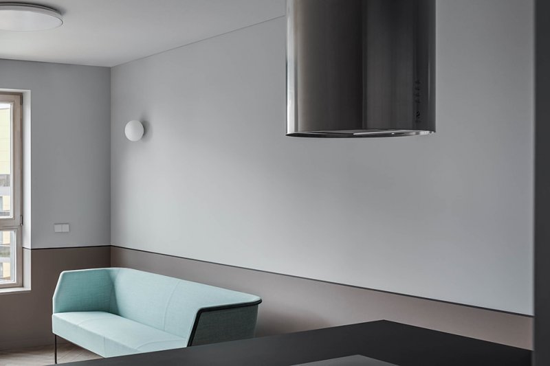 Дизайнеры Томас Умбрасас, Айдас Барзда, Таутвидас Вилейкис и Юсте Сурплитэ из литовской студии YCL оформили небольшую квартиру площадью 45,21 кв. метр в Вильнюсе. Интерьер задуман тихим, ностальгическим и даже сонным, но в то же время оживленным. Два цвета, теплый коричневый и прохладный голубоватый, задают ему настроение и визуально объединяют пространство, в котором выделены кухня-гостиная, изолированная спальня и санузел. Палитру разбавляют оттенки голубого, белый и черный. На высоте 90 см на стенах прочерчен графичный декоративный бордюр. Тонкая линия словно «разрезает» квартиру горизонтально и проводит границу через стены, мебель, двери — все, что попадается на пути. Примерно на той же высоте расположены спинка дивана, столешница кухонного острова и рабочая поверхность, раковина в ванной, подчеркивая горизонталь. Эта линия и дала название проекту — Ninety, «Девяносто».