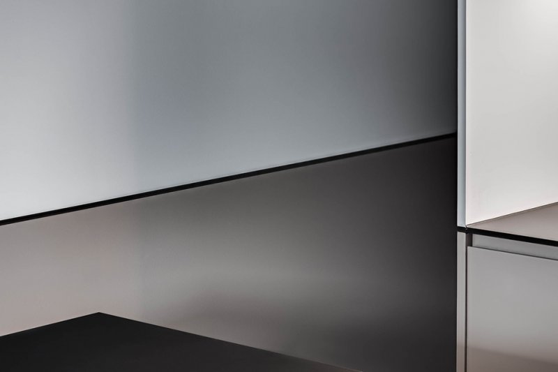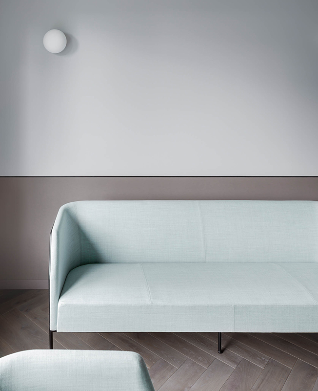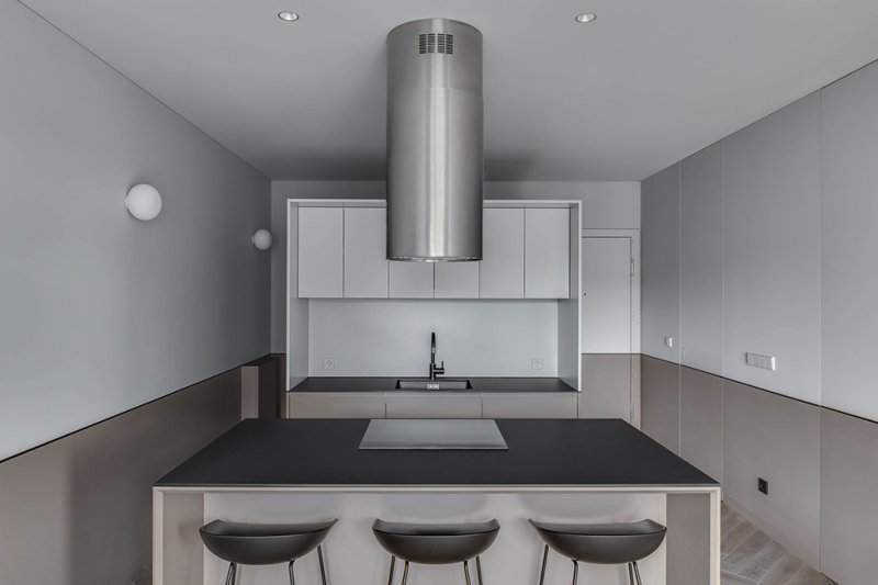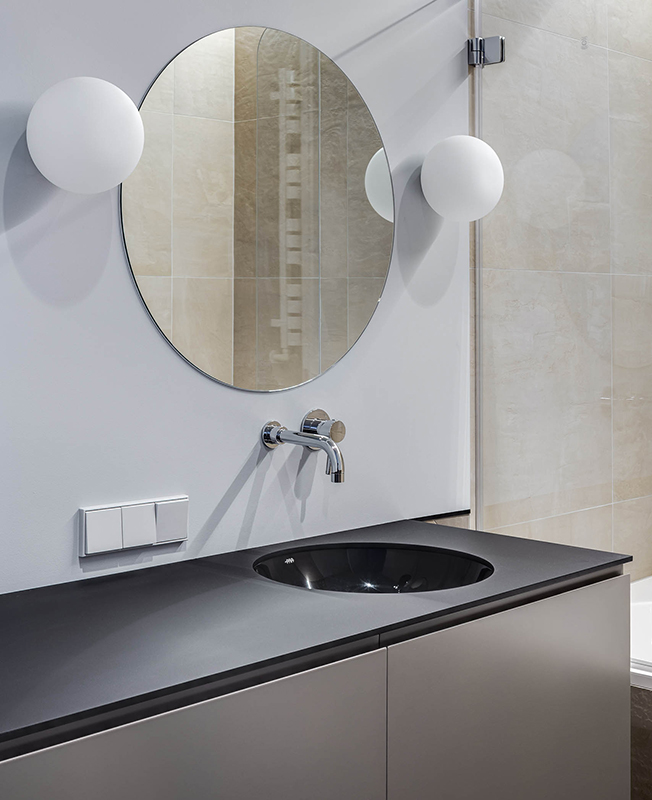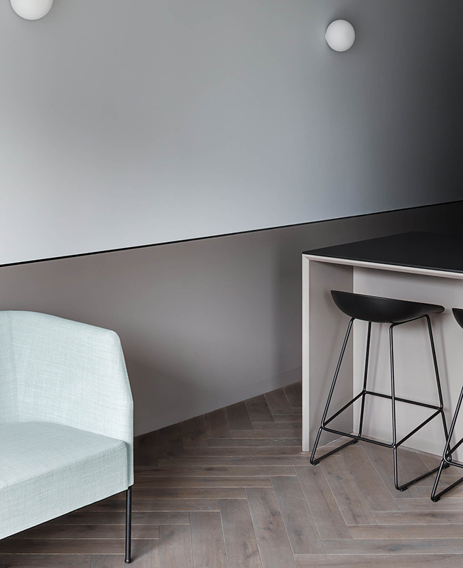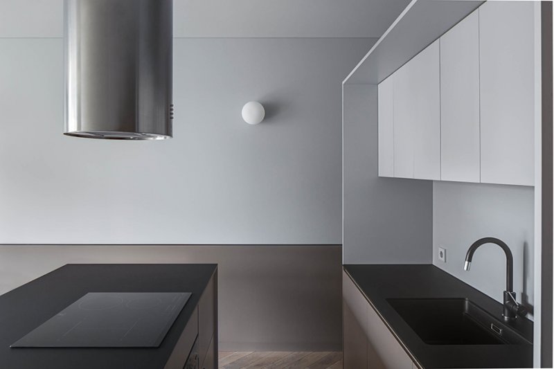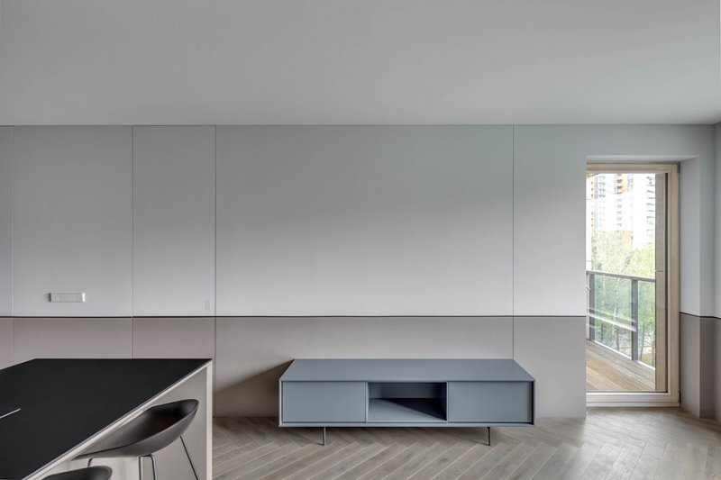 Примерно на той же высоте расположены спинка дивана, столешница кухонного острова и рабочая поверхность, раковина в ванной, подчеркивая горизонталь. Эта линия и дала название проекту — Ninety, «Девяносто».
