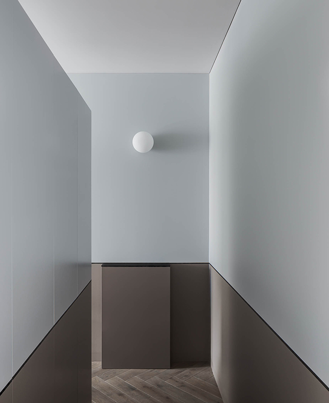 На высоте 90 см на стенах прочерчен графичный декоративный бордюр. Тонкая линия словно «разрезает» квартиру горизонтально и проводит границу через стены, мебель, двери — все, что попадается на пути.