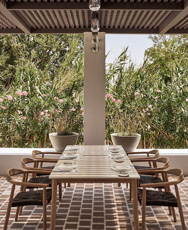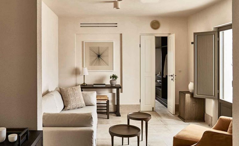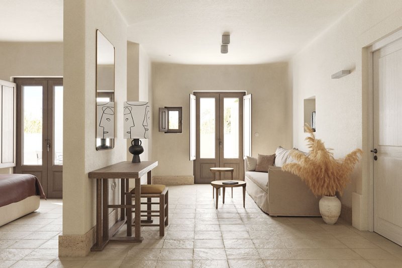 Внутри дизайнеры представили обнаженный бетон, терракотовые полы и местный мрамор в спокойной цветовой гамме белого, серого, охры и сиены. Мебель заказана по месту; обстановка сочетает серию старинных находок с предметами современного дизайна. Можно отметить вещи от 101 Copenhagen и уличные стулья архитектора Винсента Ван Дейзена.
