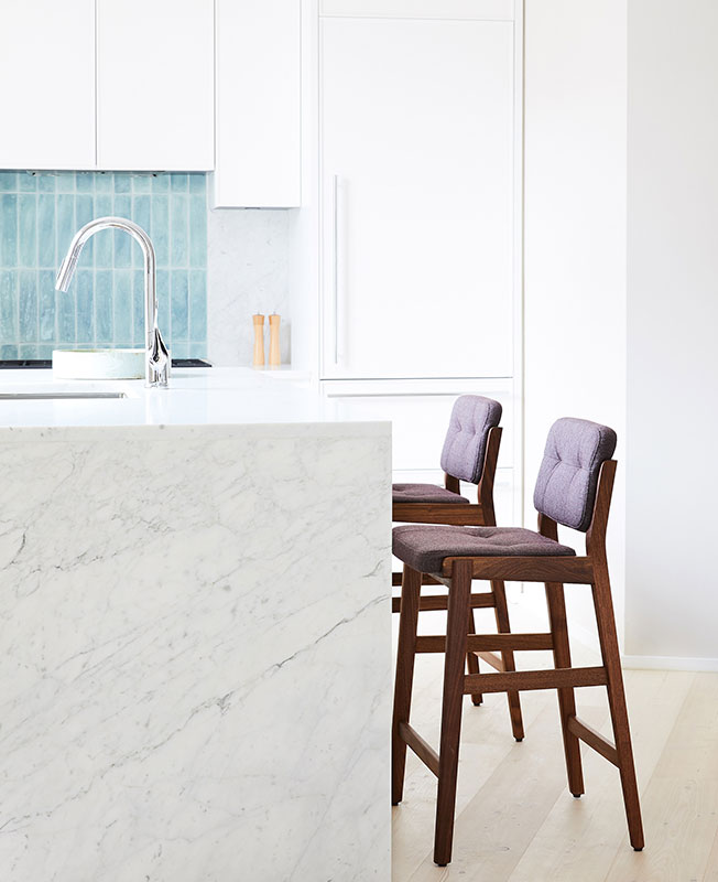 Кухня оснащена белыми шкафами и мраморной столешницей. Светлые тона контрастируют темными барными стульями Neri & Hu. Столовая расположена рядом с большим окном, декорированным полотном Calico, который называется Cope.
