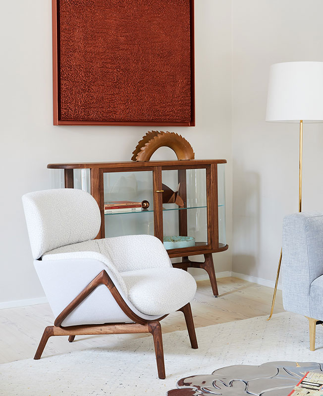 Центральным элементом гостиной является журнальный столик Orgy от бруклинского дизайнера Криса Уолстона. Его алюминиевый верх изображает части тела, входящие друг в друга. За жилой зоной спрятан стеклянный шкаф-витрина Solo от Neri & Hu, имеющий изогнутую форму.