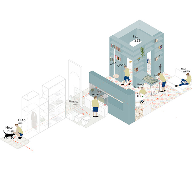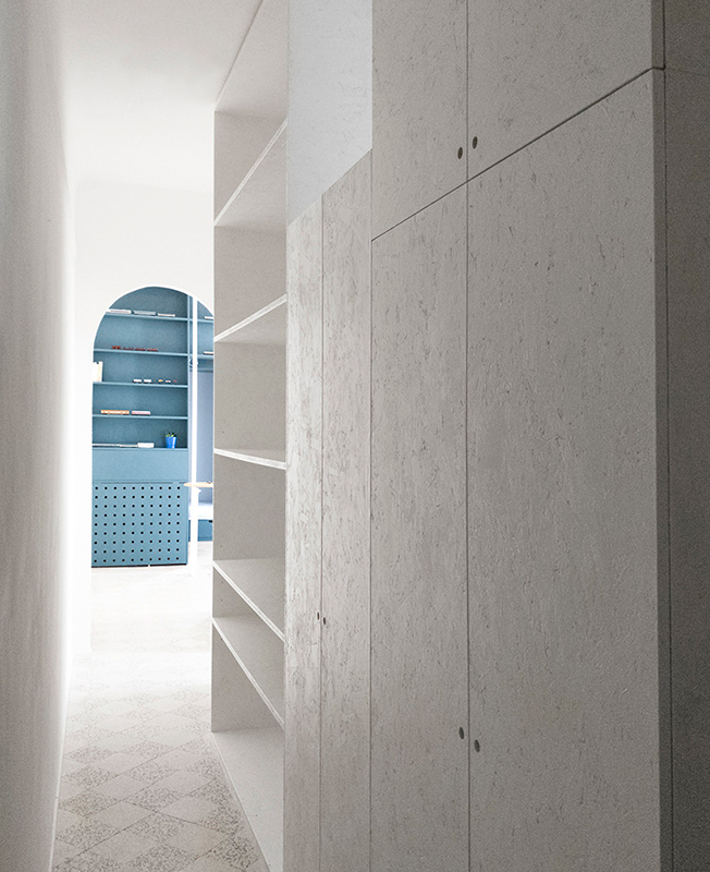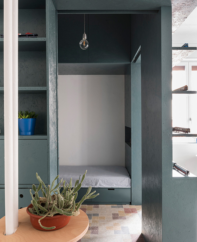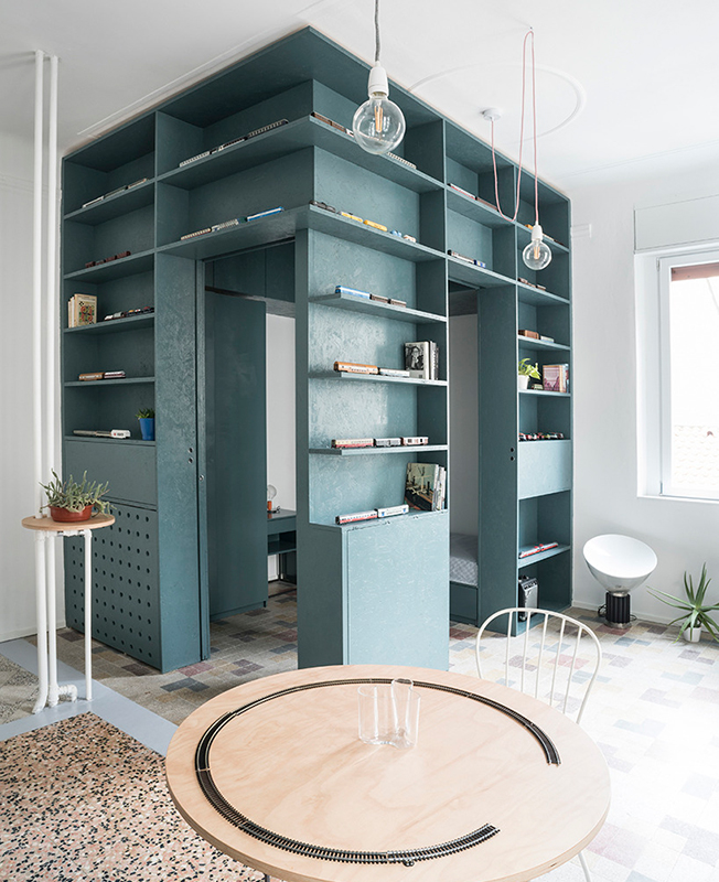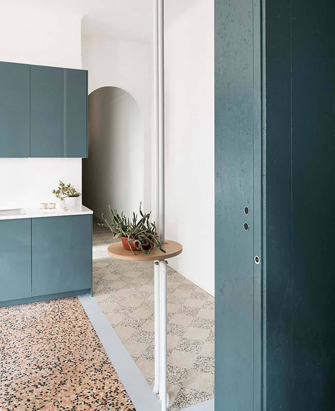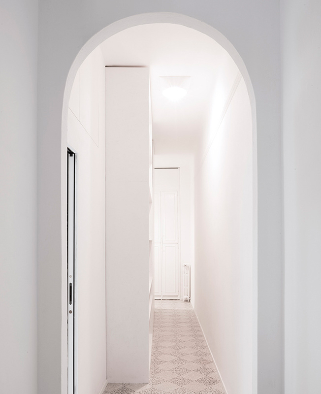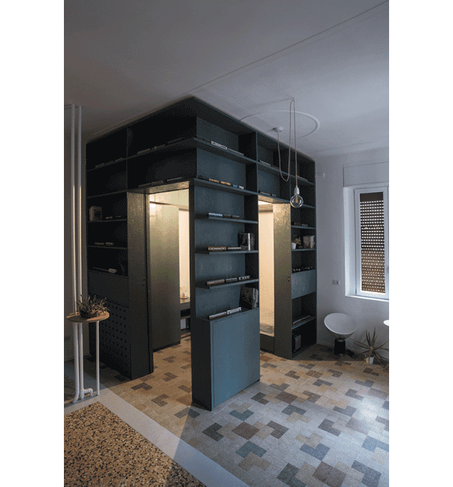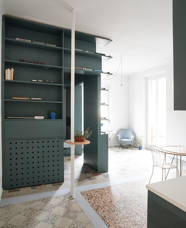 Квартира площадью 50 кв. метров в доме начала XX века в Милане — проект студии Quinzii Terna Architecture. Одна из задач проекта — подчеркнуть, что то, что раньше было экономичным вариантом, сегодня считается современным и ценным. Среди достоинств квартиры — высокие потолки, длинный коридор, довольно просторные комнаты. Но не все ее особенности были удобны для проживавших здесь людей. За долгие годы каждый из жильцов внес небольшие изменения: например, появилась арка между входом и жилой зоной — первая попытка сделать пространство более открытым. Работая над проектом, архитекторы Quinzii Terna Architecture хотели отдать дань уважения изначальному замыслу тех, кто спроектировал дом, а также отметить следы предыдущих жителей. Обновленное пространство, по их словам — «объект величайшего преобразования». Новый проект меняет старый, не разрушая его и не избавляясь от него полностью. В интерьере подчеркнули детали, присущие дому, построенному для представителей низшего среднего класса: лаконичные гипсовые молдинги на потолках, полы с терраццо (предназначенные для тех, кто не мог позволить себе настоящие мраморные полы), окна с системой двойного затемнения — внутренними и наружными ставнями. Сохраняя свои оригинальные черты, помещение освобождается и перестраивается с помощью мебели и конструктивных элементов. Гибкие и трансформируемые, они легко адаптируются к меняющимся потребностям жильцов. Визуальной доминантой стал многофункциональный блок: снаружи предусмотрены многочисленные полки и откидной стол, внутри выделена зона спальни. А на трубах отопления, которые в этом доме расположены в середине помещения, а не по периметру, установлена круглая столешница.