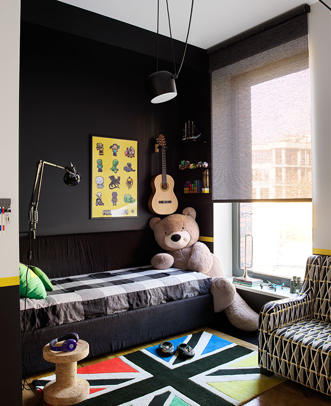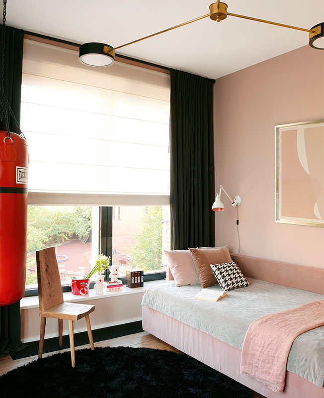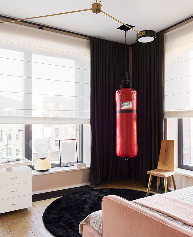 Черный появился во всех спальнях — главной и детских. Для комнаты дочери создали контрастный интерьер, сочетающий брутальные и феминные черты. Ведь основным пожеланием для помещения было обязательное наличие боксерской груши.