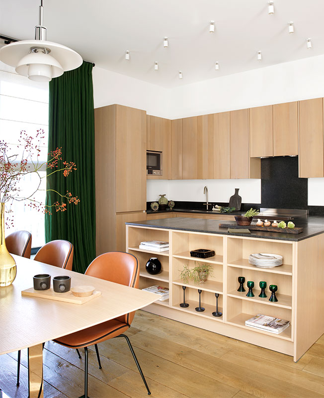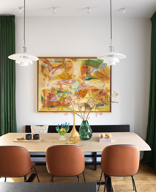 Как и задумывала дизайнер, в интерьере классика дизайна соседствует с современными работами. В гостиной у столика Исаму Ногучи 1944-го года расположено кресло Родольфо Дордони 2011-го года для Minotti; над лаконичным обеденным столом B&B Italia и стульями Gubi дизайнер разместила легендарные светильники PH Поула Хеннингсена и т.д.