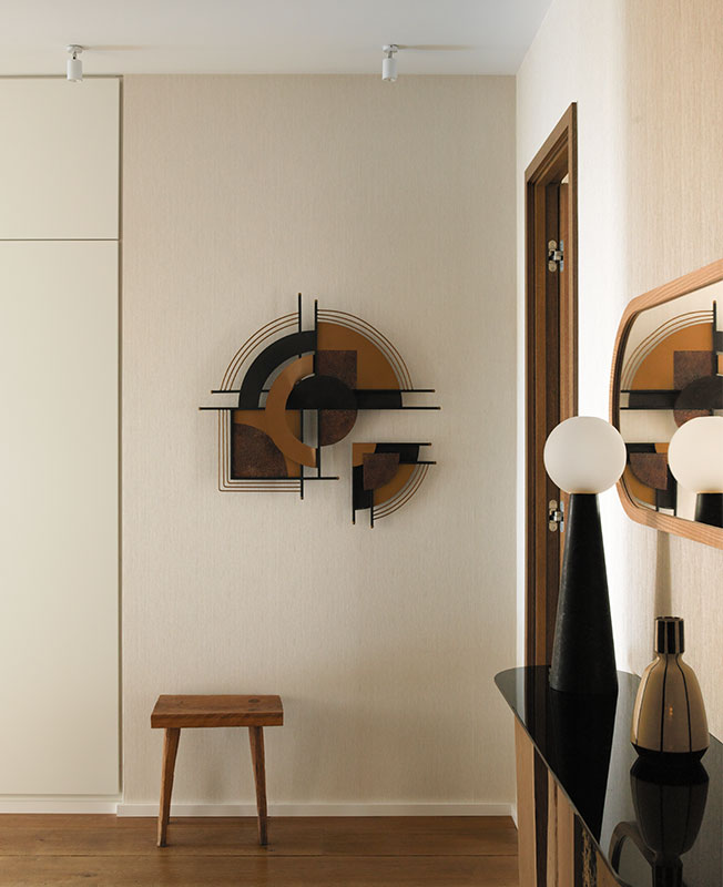 Настроение интерьеру задает искусство. Центр гостиной — картина Дирка Сальца. Ее я увидела на выставке в Лондоне, и она мне очень понравилась. По возвращению в Москву заказчица стала мне описывать ощущения того, что именно ей хотелось бы видеть над камином, и я сразу поняла — это точное попадание. Через неделю хозяйка квартиры вылетела в Барселону лично смотреть эту работу в галерее. Но ради искусства нам пришлось укрепить камин — картина весила более 30 кг.